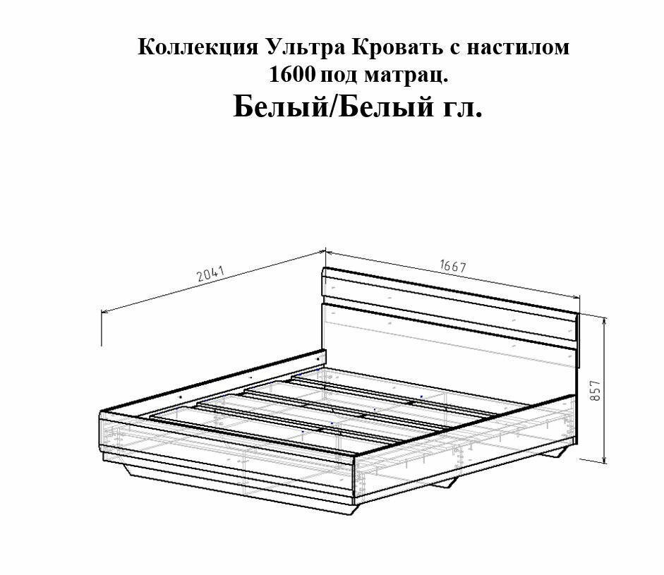 Коллекция Ультра Кровать 1600 с НАСТИЛОМ под матрац Белый/Белый гл. (160х200, детская, взрослая, с основанием, МДФ) информация: