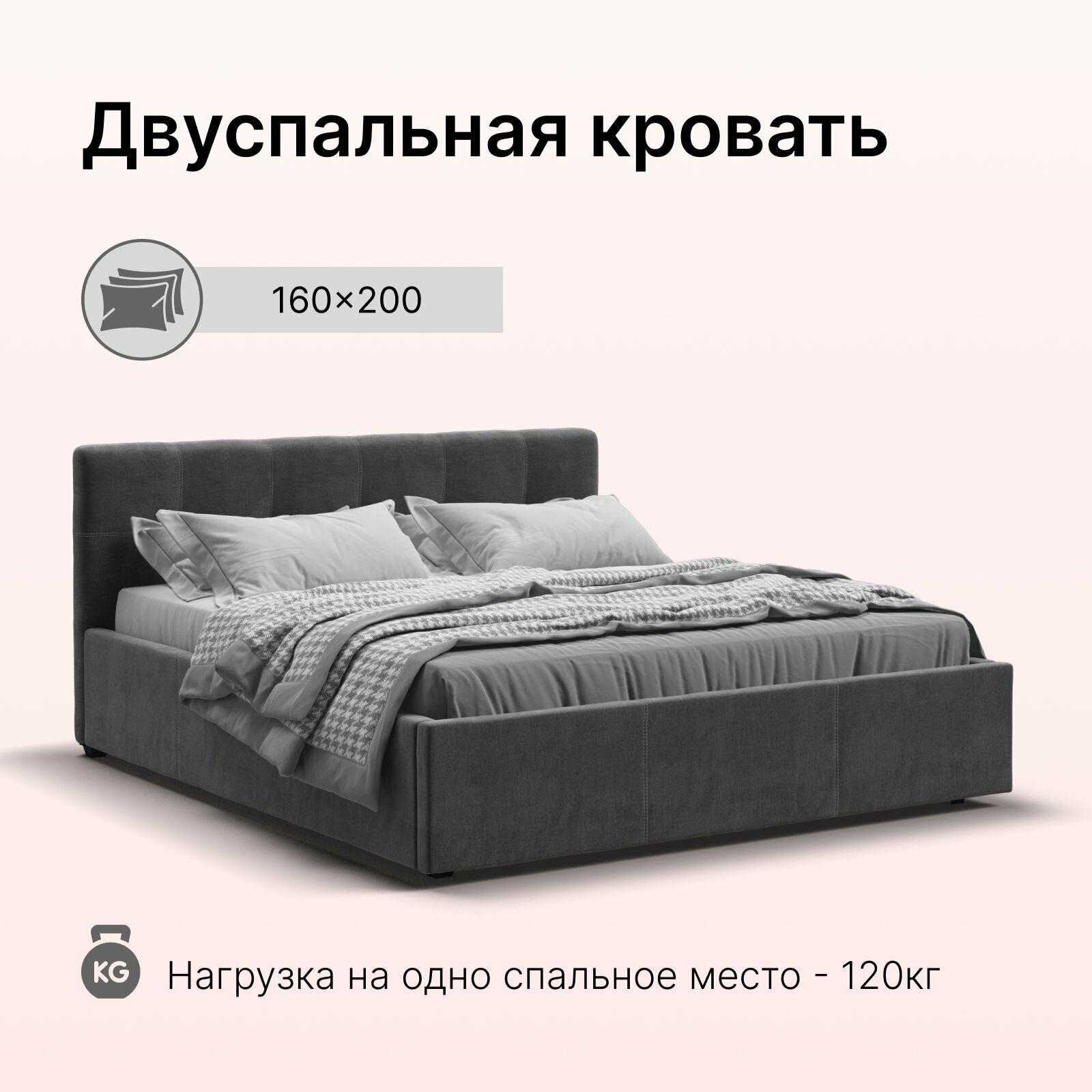 Двуспальная кровать Белла, с подъемным механизмом, велюр Monolit серый, 160х200 см информация: