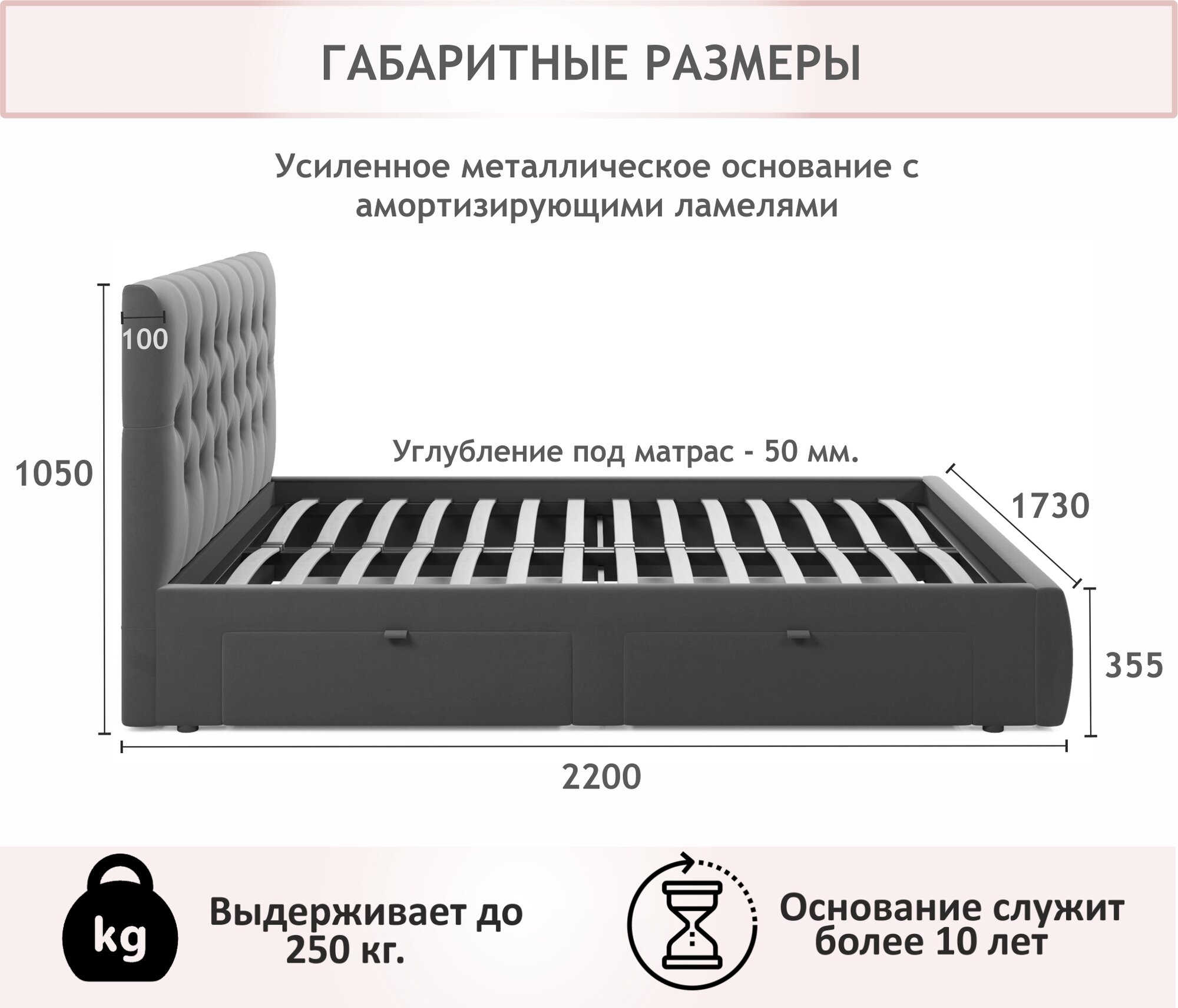 Двуспальная кровать Verona 1600 серая Zeppelin с ящиками и ортопедическим основанием, 160х200, мягкая из велюра, ламели, выкатные ящики 28 000 ₽