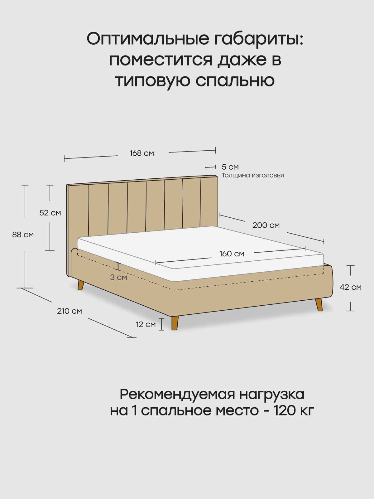 Двуспальная кровать 120х200 "TERK" с мягким изголовьем для дома, для спальни. Велюр серый Dakota 24 27 754 ₽