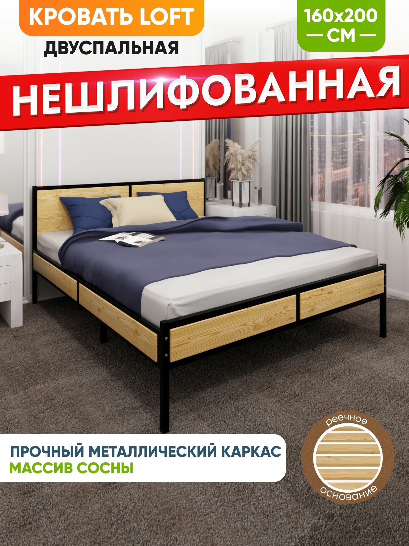 Кровать двуспальная Лофт с реечным основанием, без шлифовки и покраски с черным металлическим каркасом, 160х200 см информация: