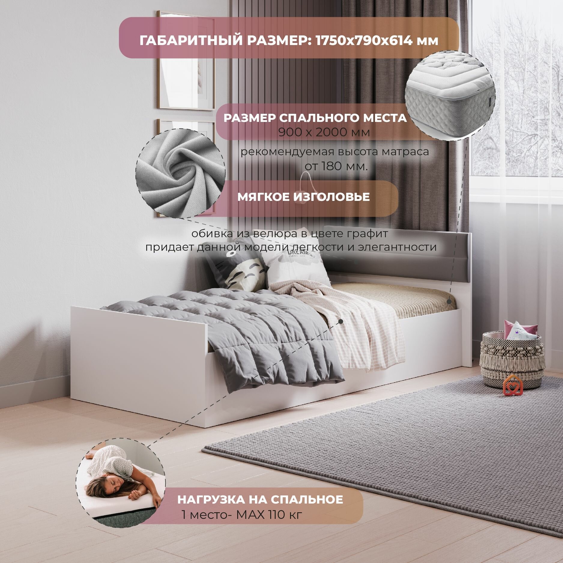 Кровать односпальная деревянная Фьюжн 90х200 с мягким изголовьем информация: