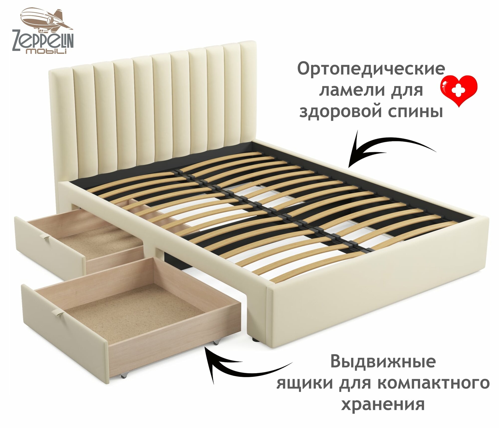 Отзывы на Двуспальная кровать Olivia 1600 бежевая Zeppelin с ящиками и ортопедическим основанием, 160х200, мягкая из велюра, ламели, выкатные ящики