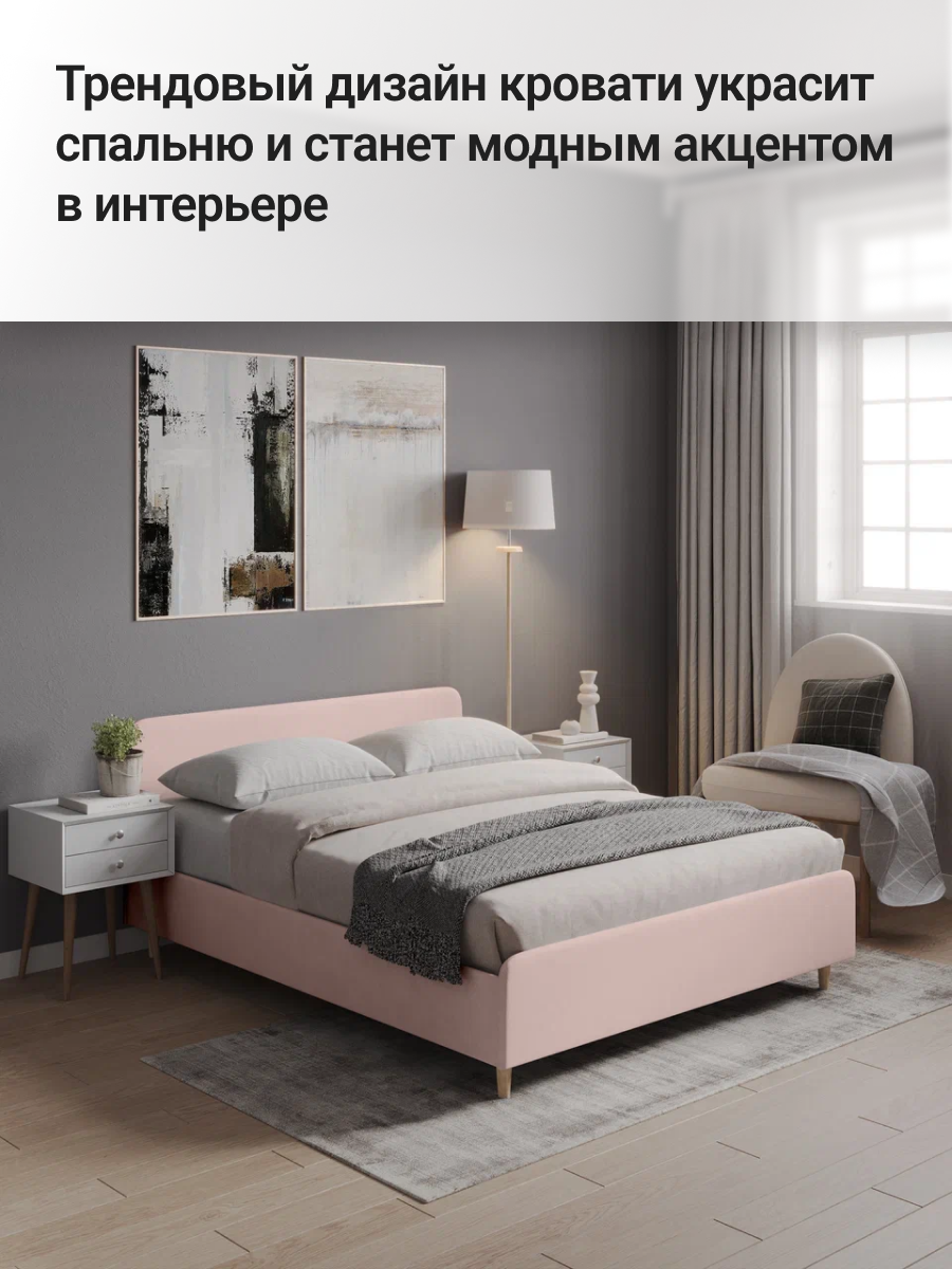 Полутороспальная кровать Микки 140x200 с подъемным механизмом и с коробом для белья велюр розовый ножки 5 см