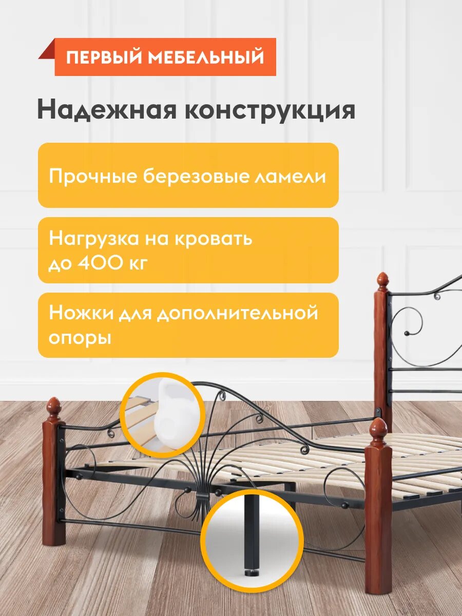 Отзывы на Кровать двуспальная металлическая кровать Синди 160х200 см, Черный металл, каркас / Махагон массив, опоры