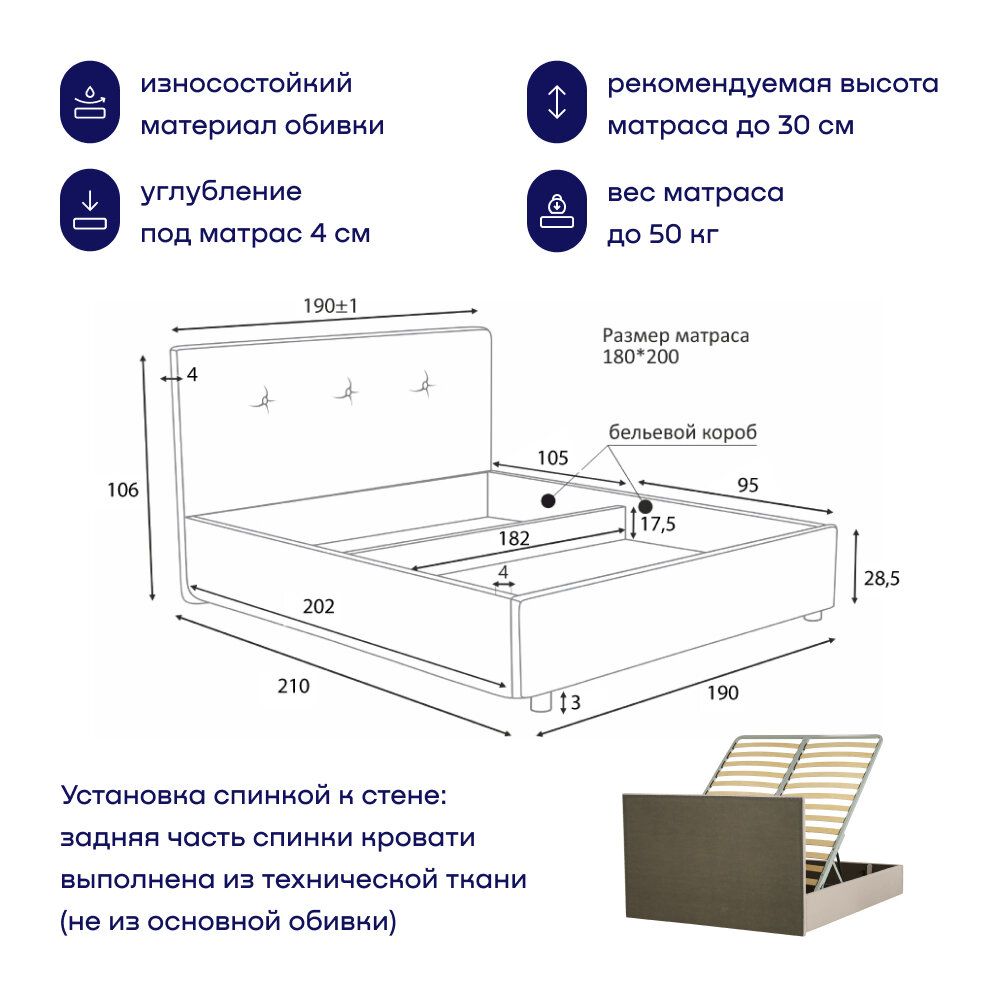 Двуспальная кровать buyson BuyRelax 200х180 с подъемным механизмом, бежевая микровелюр информация: