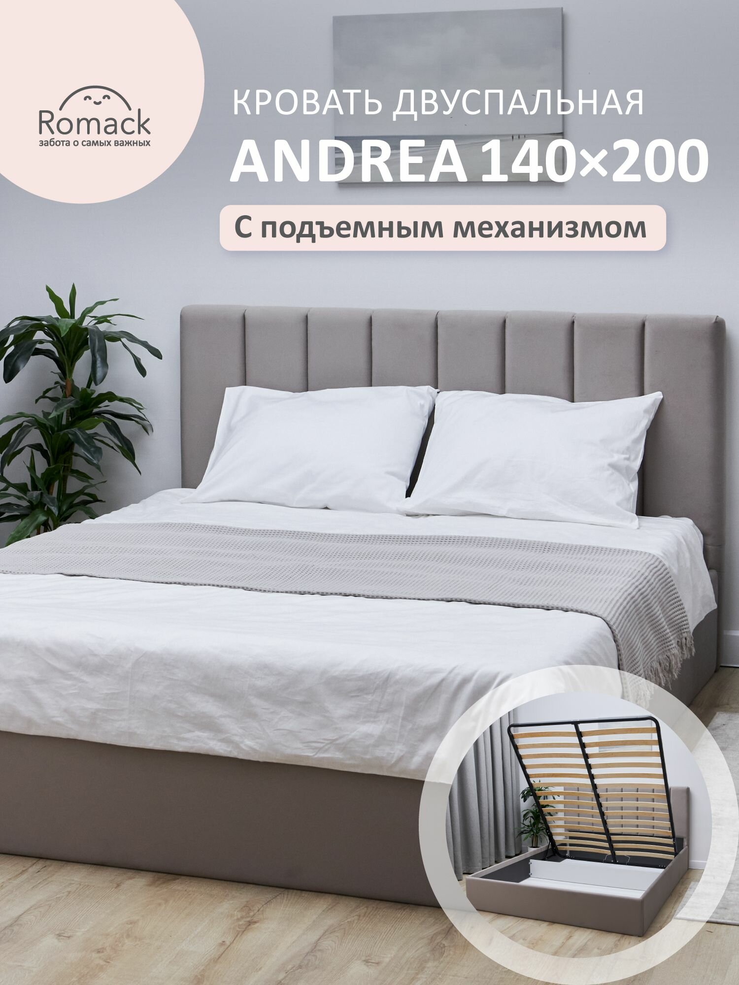 Кровать двуспальная 140x200 Romack Andrea Серый пух с подъемным механизмом, ящиком для хранения 29 400 ₽