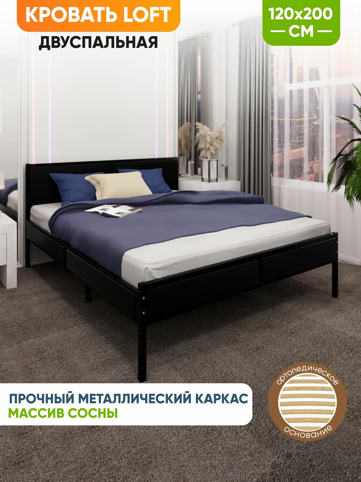 10 цен на Кровать двуспальная Лофт с ортопедическим основанием, цвет черного оникса с черным металлическим каркасом, 120х200 см