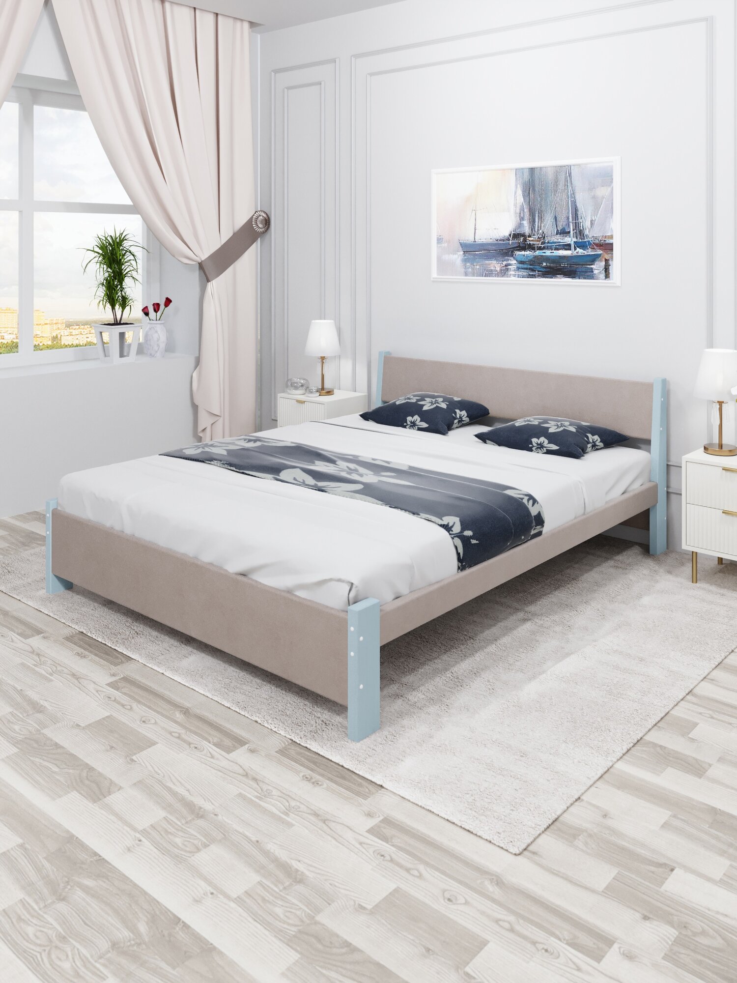 Кровать двуспальная Мишка из массива сосны, 180х200 см, с реечным основанием и светло-серой мягкой обивкой, цвет ножек голубой 20 203 ₽