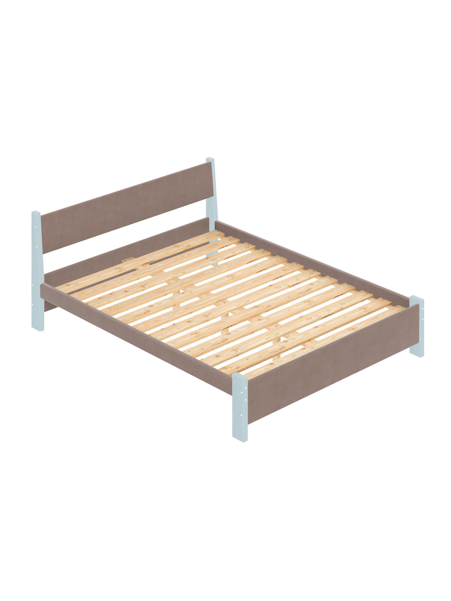 Кровать двуспальная Мишка из массива сосны, 120х200 см, с реечным основанием и мягкой обивкой цвета Мокко Мусс, цвет ножек голубой информация:
