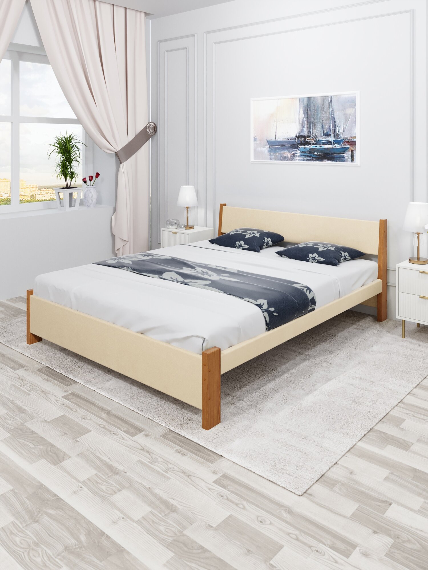 Кровать двуспальная Мишка из массива сосны, 160х200 см, с реечным основанием и бежевой мягкой обивкой, цвет ножек ольха 19 705 ₽
