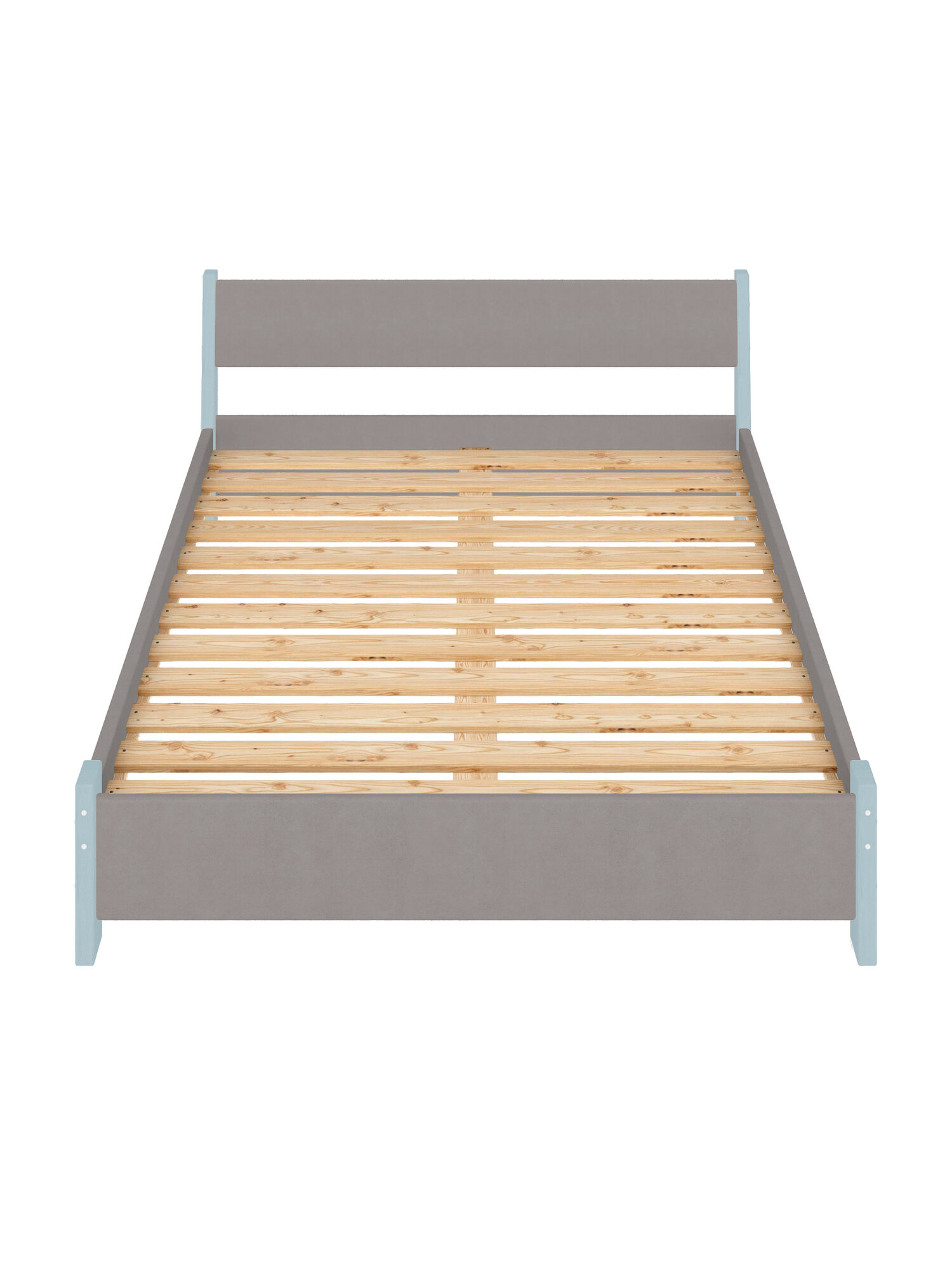 Кровать двуспальная Мишка из массива сосны, 120х200 см, с реечным основанием и светло-серой мягкой обивкой, цвет ножек голубой 18 632 ₽