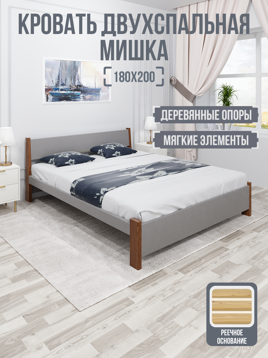 Отзывы на Кровать двуспальная Мишка из массива сосны, 180х200 см, с реечным основанием и светло-серой мягкой обивкой, цвет ножек темный дуб