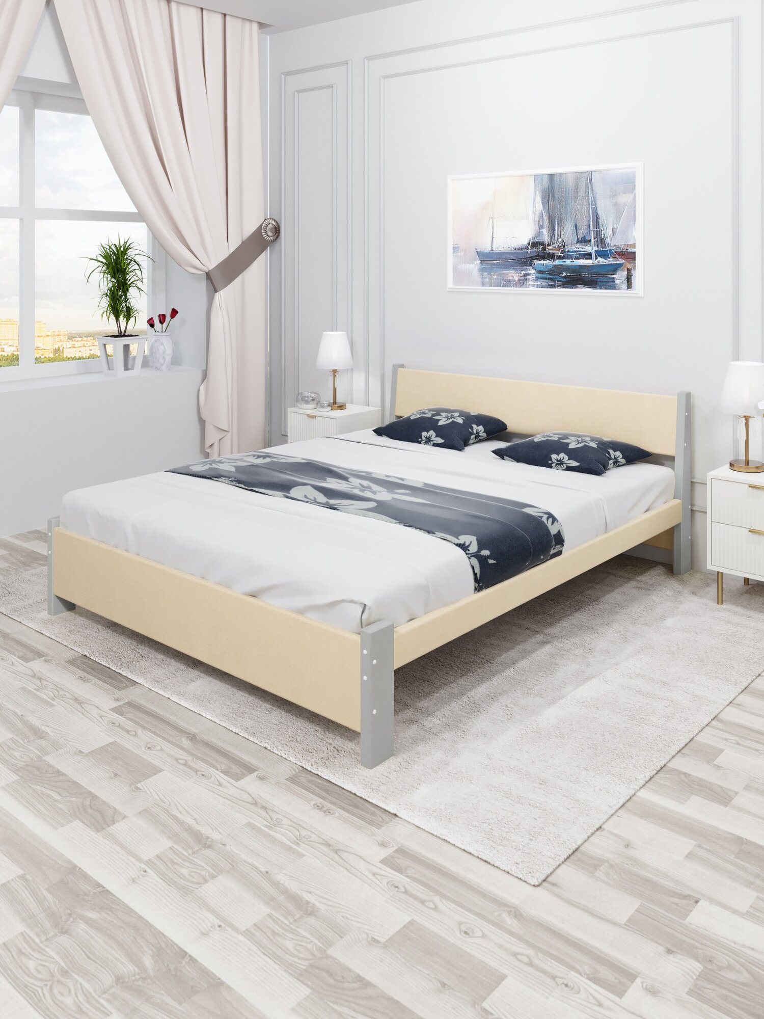 10 цен на Кровать двуспальная Мишка из массива сосны, 140х200 см, с реечным основанием и бежевой мягкой обивкой, цвет ножек платина