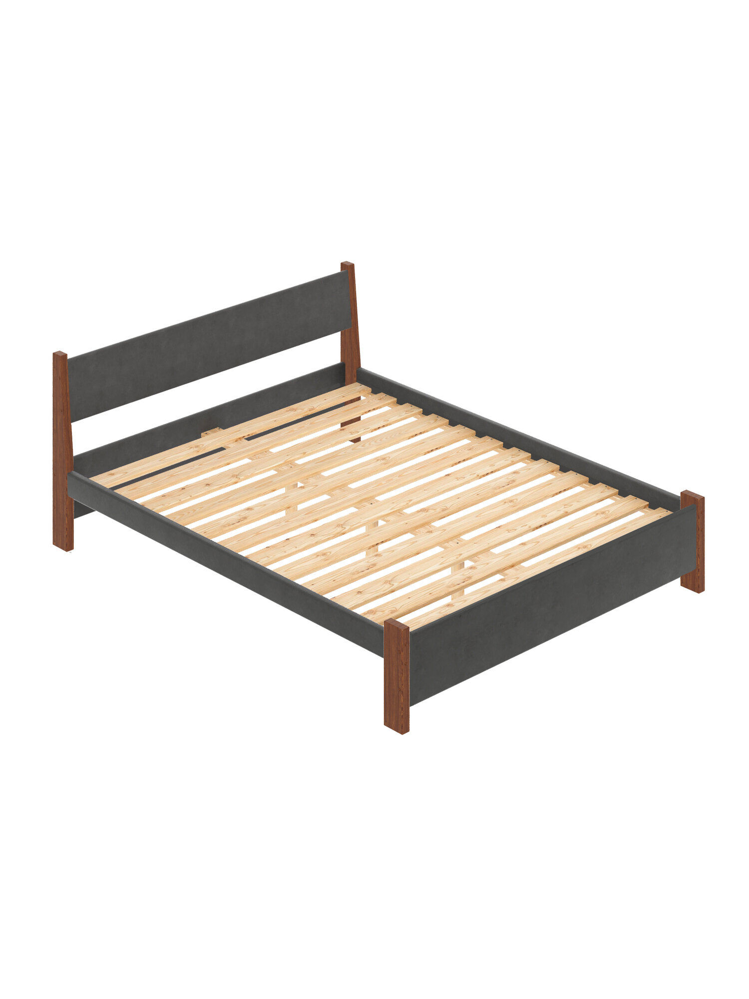 Кровать двуспальная Мишка из массива сосны, 160х200 см, с реечным основанием и темно-серой мягкой обивкой, цвет ножек темный дуб информация: