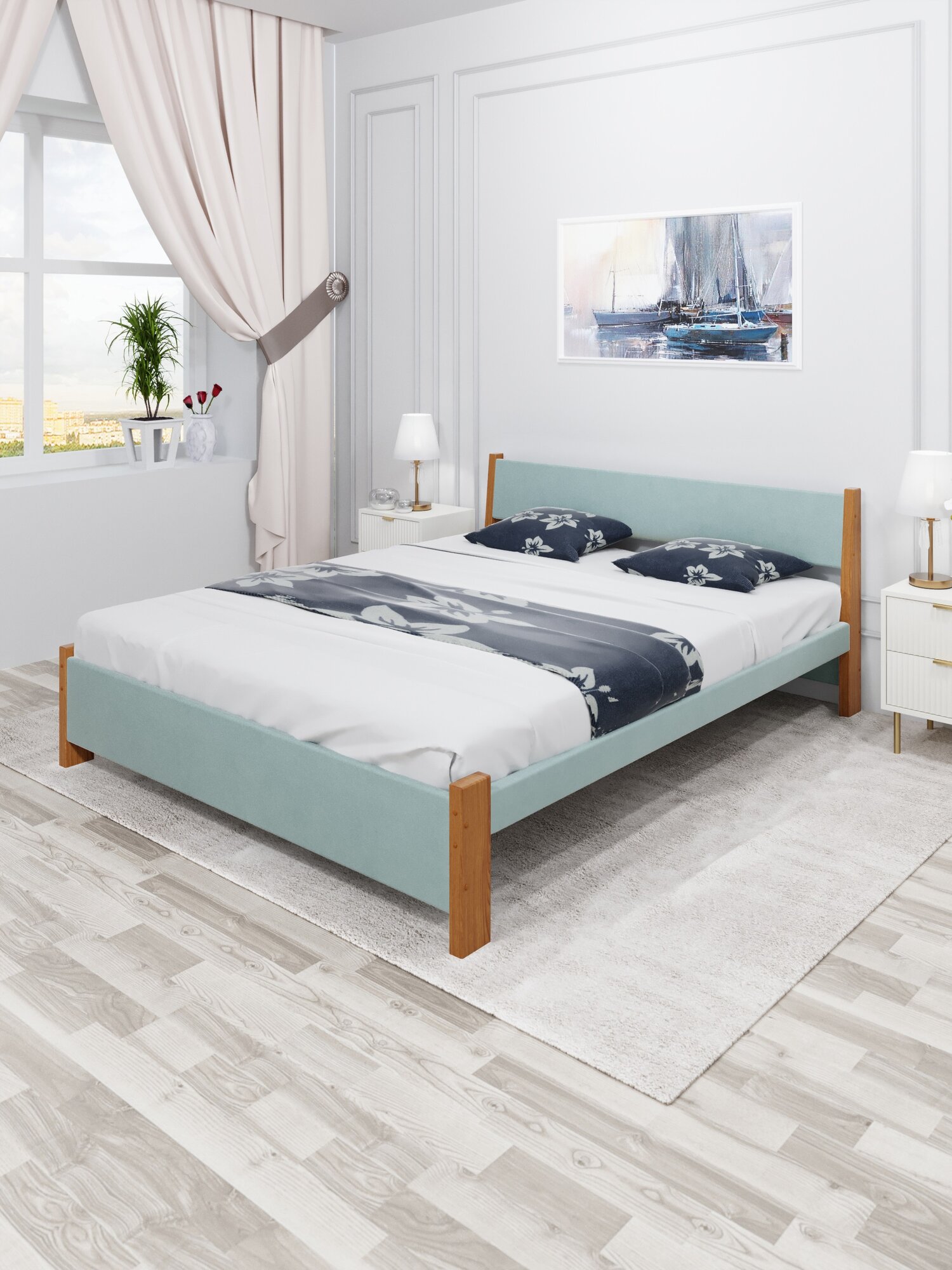 Кровать двуспальная Мишка из массива сосны, 180х200 см, с реечным основанием и мягкой обивкой цвета Тиффани, ножки лакированные 20 203 ₽