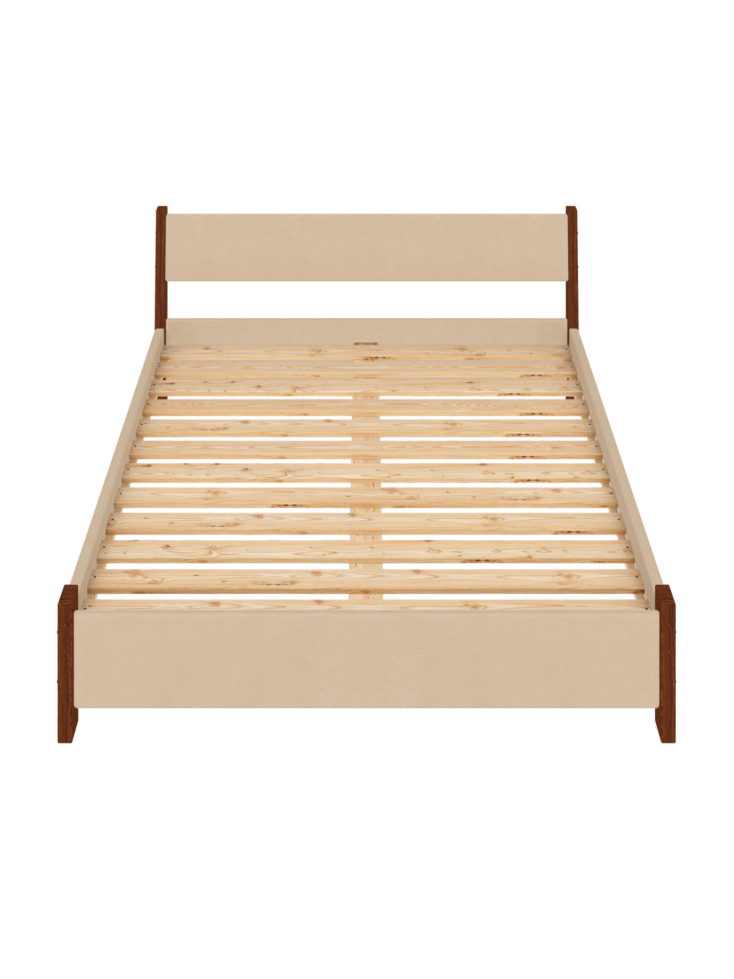 Кровать двуспальная Мишка из массива сосны, 160х200 см, с реечным основанием и бежевой мягкой обивкой, цвет ножек темный дуб информация: