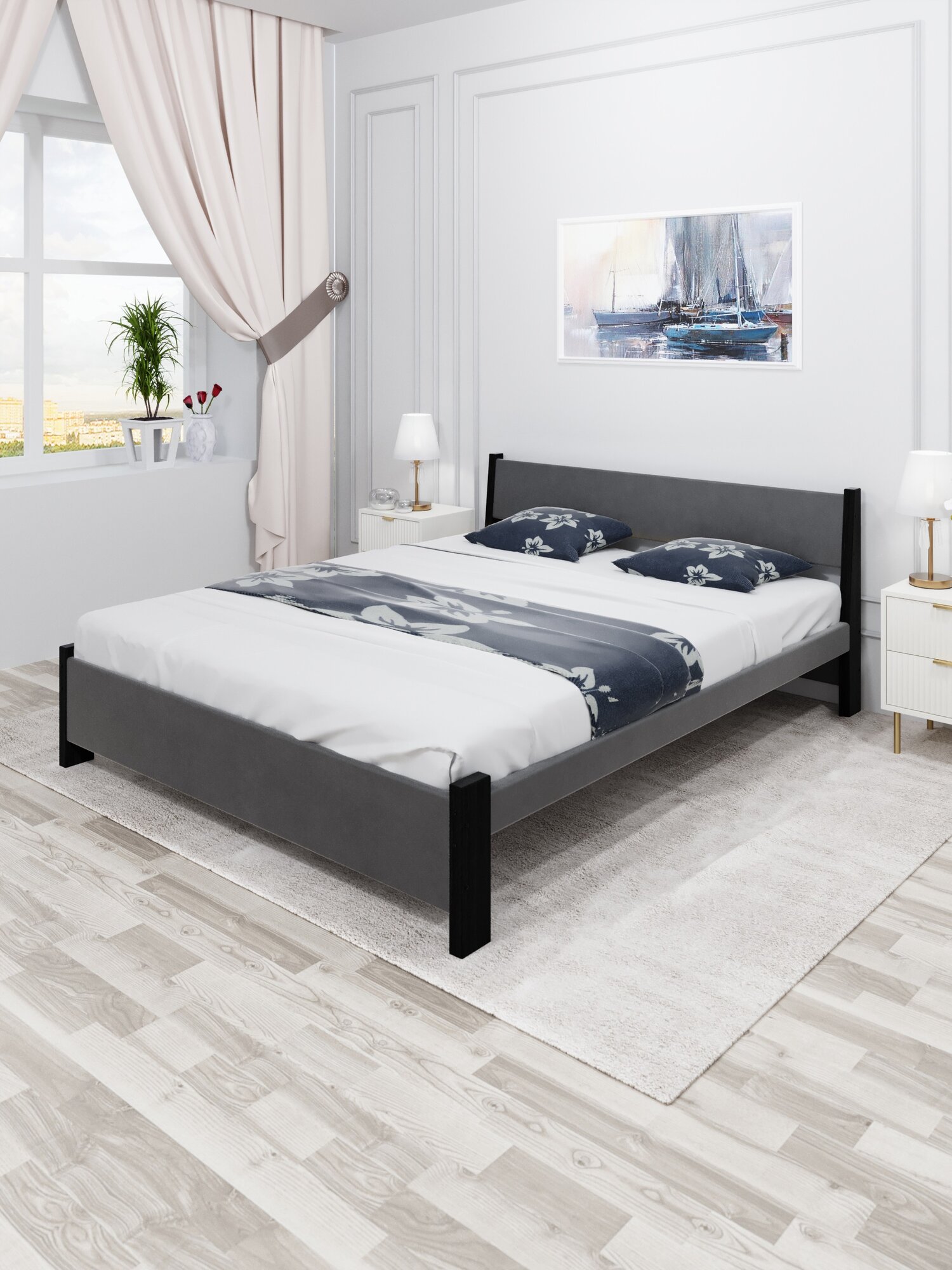 Кровать двуспальная Мишка из массива сосны, 180х200 см, с реечным основанием и светло-серой мягкой обивкой, цвет ножек антрацит 20 203 ₽