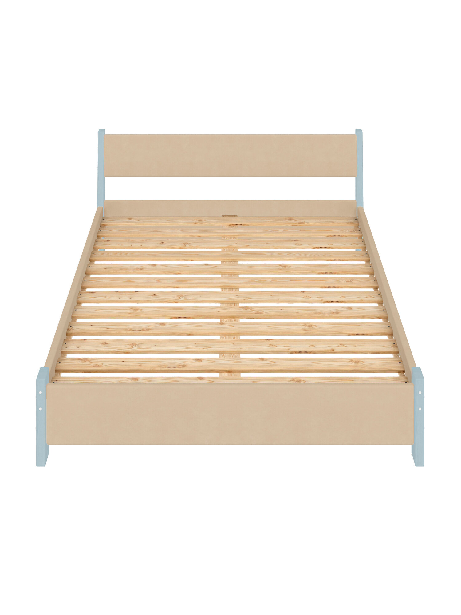 Кровать двуспальная Мишка из массива сосны, 160х200 см, с реечным основанием и бежевой мягкой обивкой, цвет ножек голубой информация: