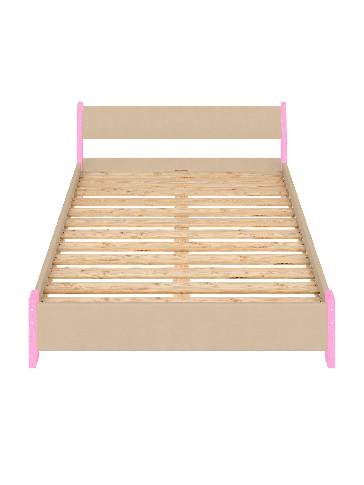Кровать двуспальная Мишка из массива сосны, 180х200 см, с реечным основанием и бежевой мягкой обивкой, цвет ножек розовый информация: