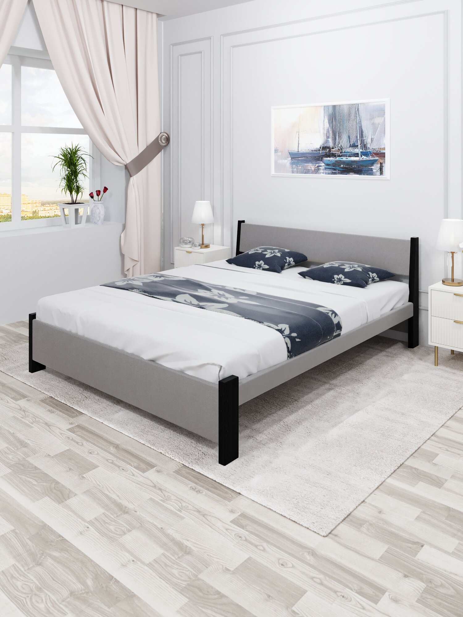 Кровать двуспальная Мишка из массива сосны, 180х200 см, с реечным основанием и светло-серой мягкой обивкой, цвет ножек черный оникс информация: