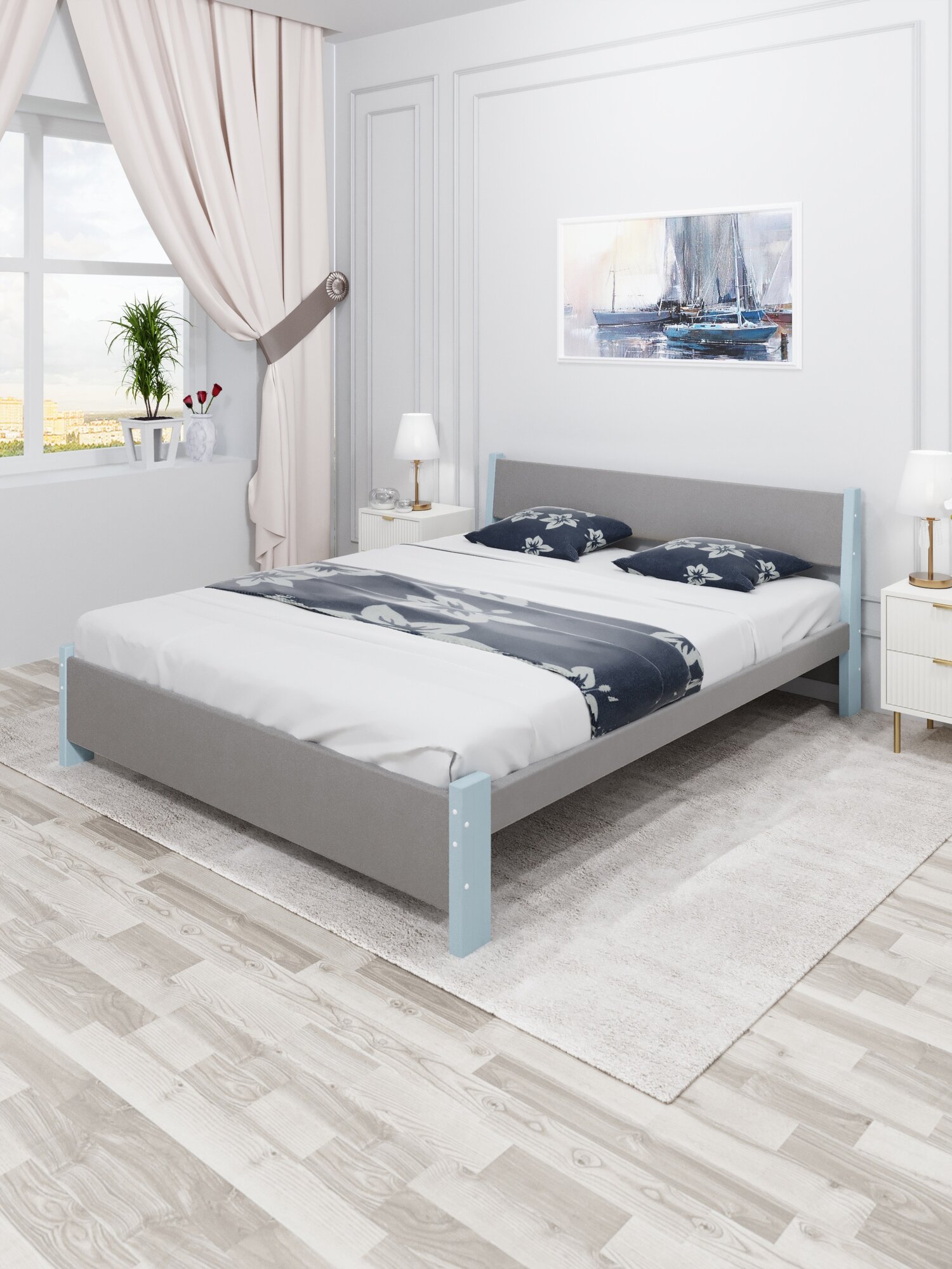Кровать двуспальная Мишка из массива сосны, 180х200 см, с реечным основанием и светло-серой мягкой обивкой, цвет ножек голубой 20 203 ₽