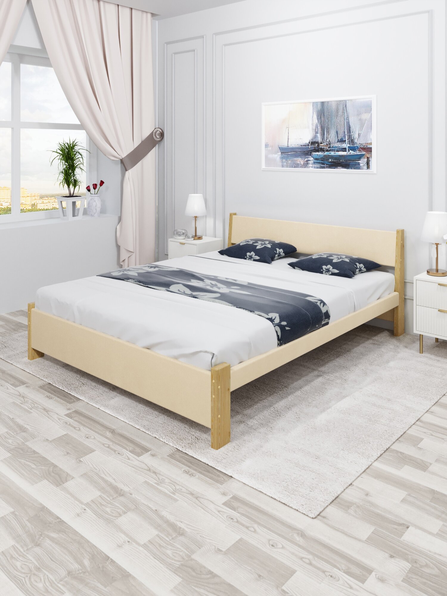 Кровать двуспальная Мишка из массива сосны, 180х200 см, с реечным основанием и бежевой мягкой обивкой, цвет ножек ваниль 20 203 ₽