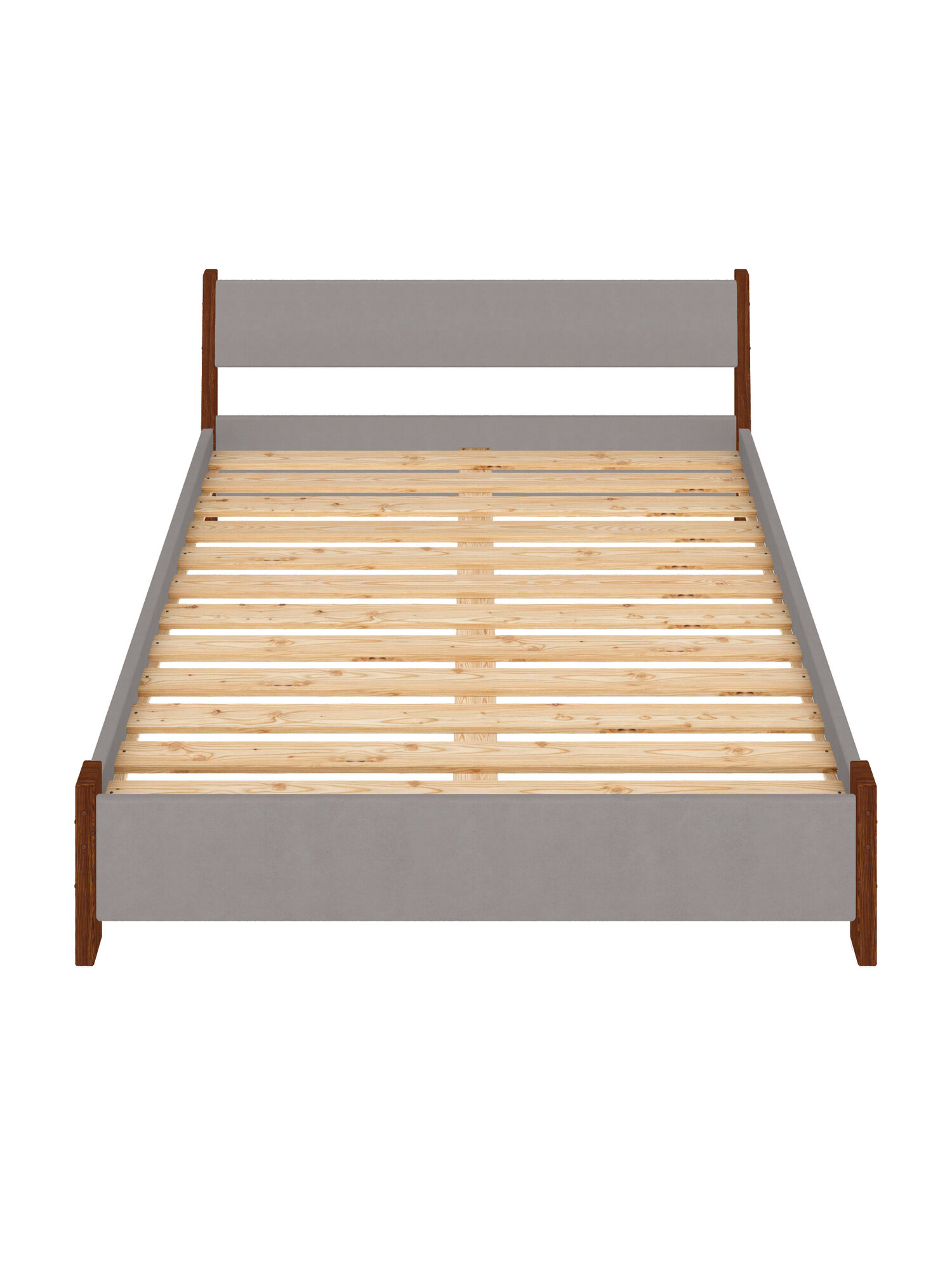 Кровать двуспальная Мишка из массива сосны, 120х200 см, с реечным основанием и светло-серой мягкой обивкой, цвет ножек темный дуб информация: