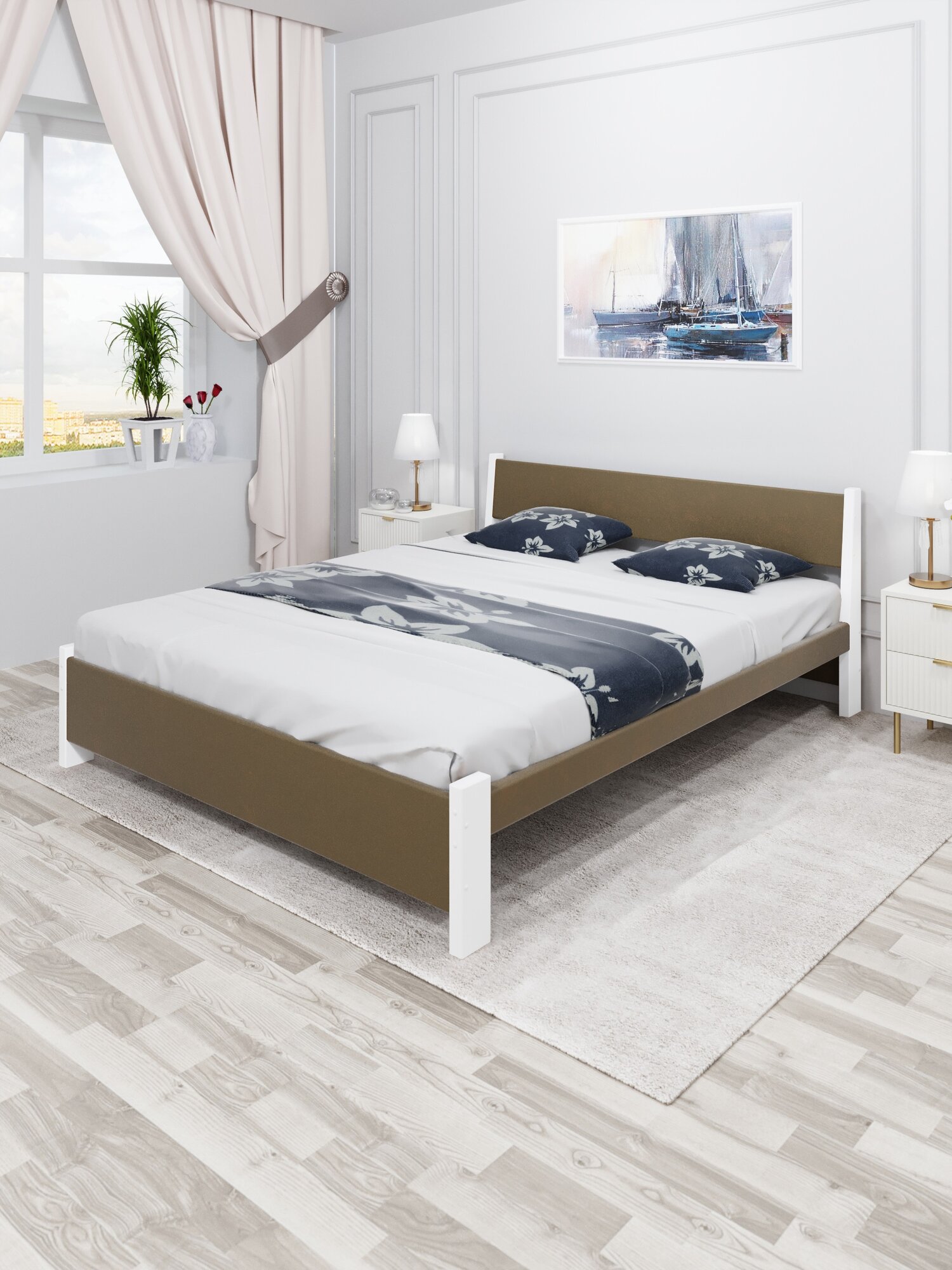 Кровать двуспальная Мишка из массива сосны, 160х200 см, с реечным основанием и коричневой мягкой обивкой, цвет ножек белый 19 705 ₽