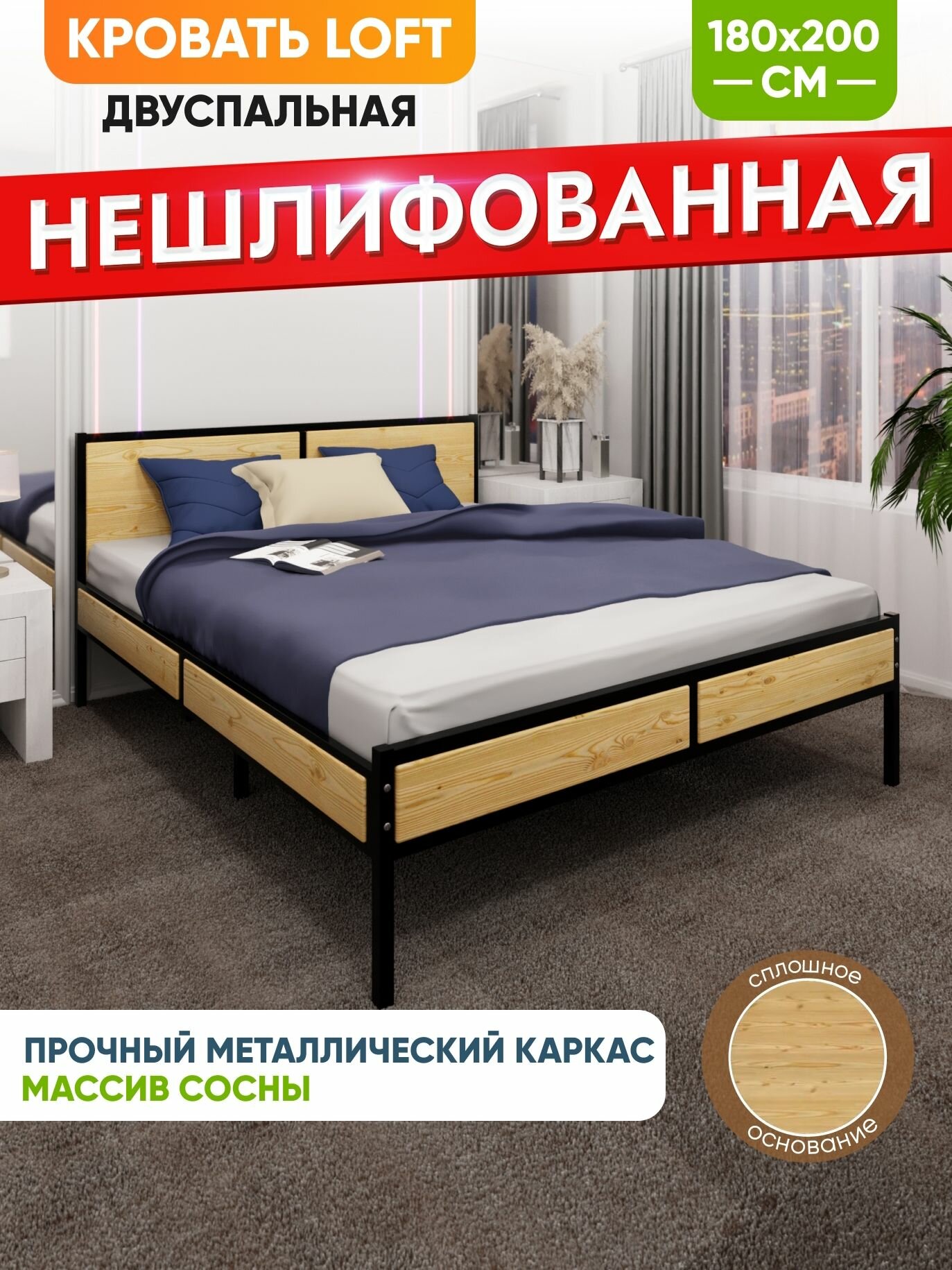 Кровать двуспальная Лофт со сплошным основанием, без шлифовки и покраски с черным металлическим каркасом, 180х200 см информация: