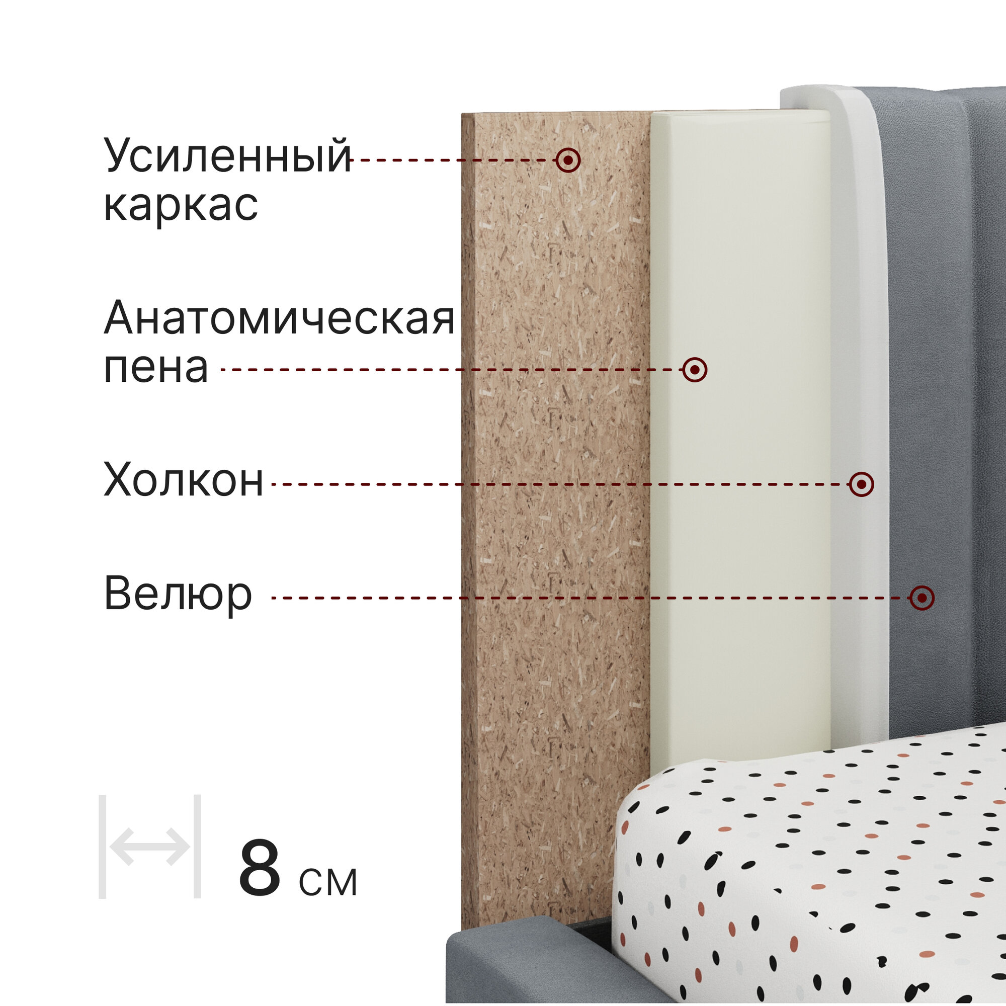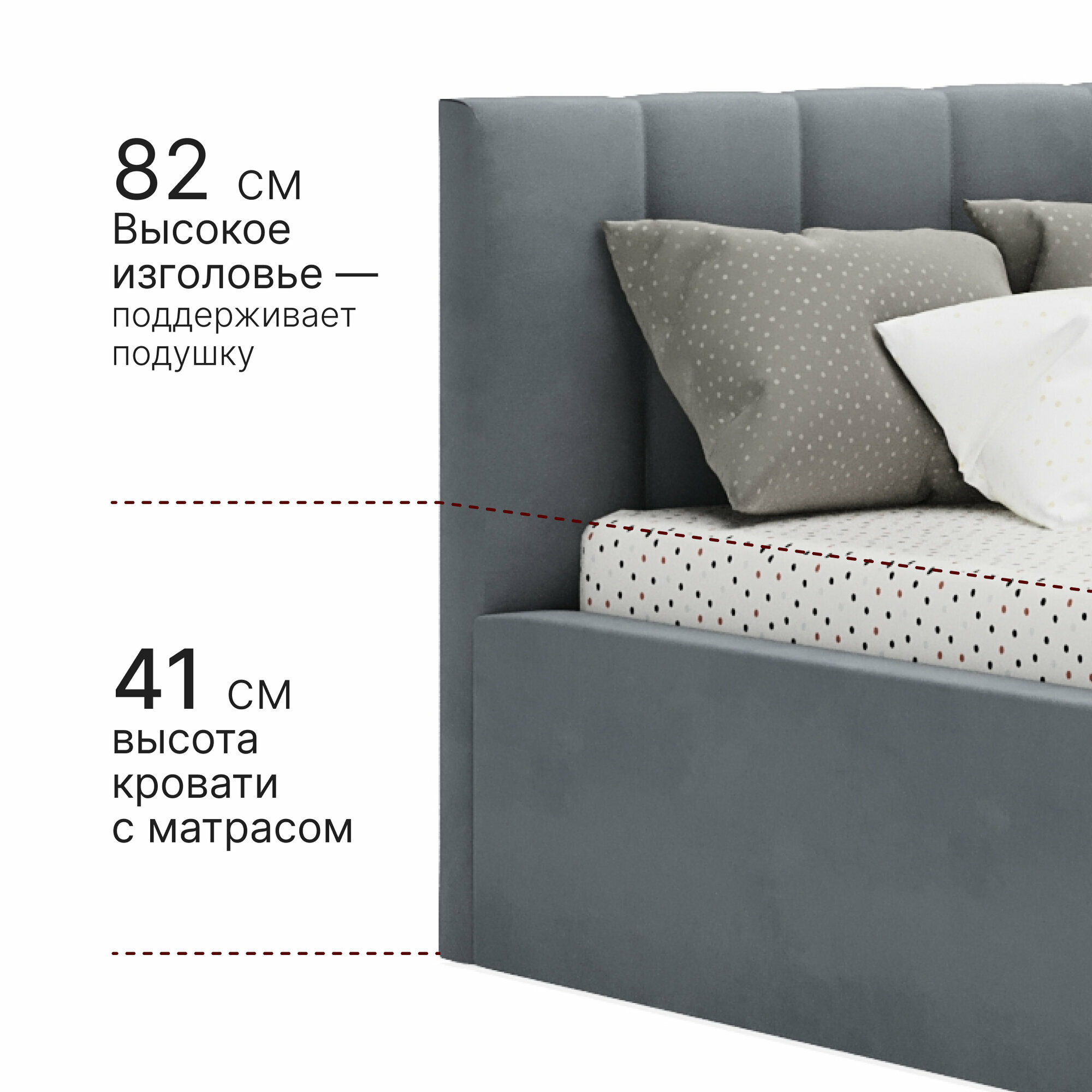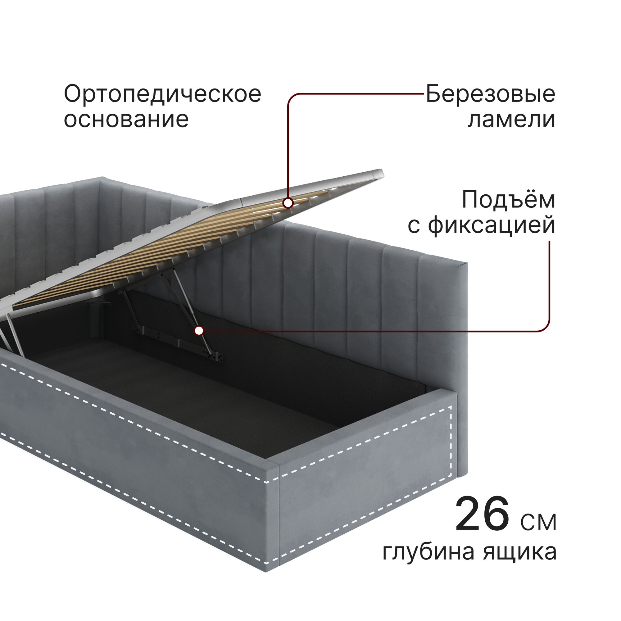 Кровать 90х200 c подъемным механизмом и ящиком для белья Mia, велюр, темно-серый информация: