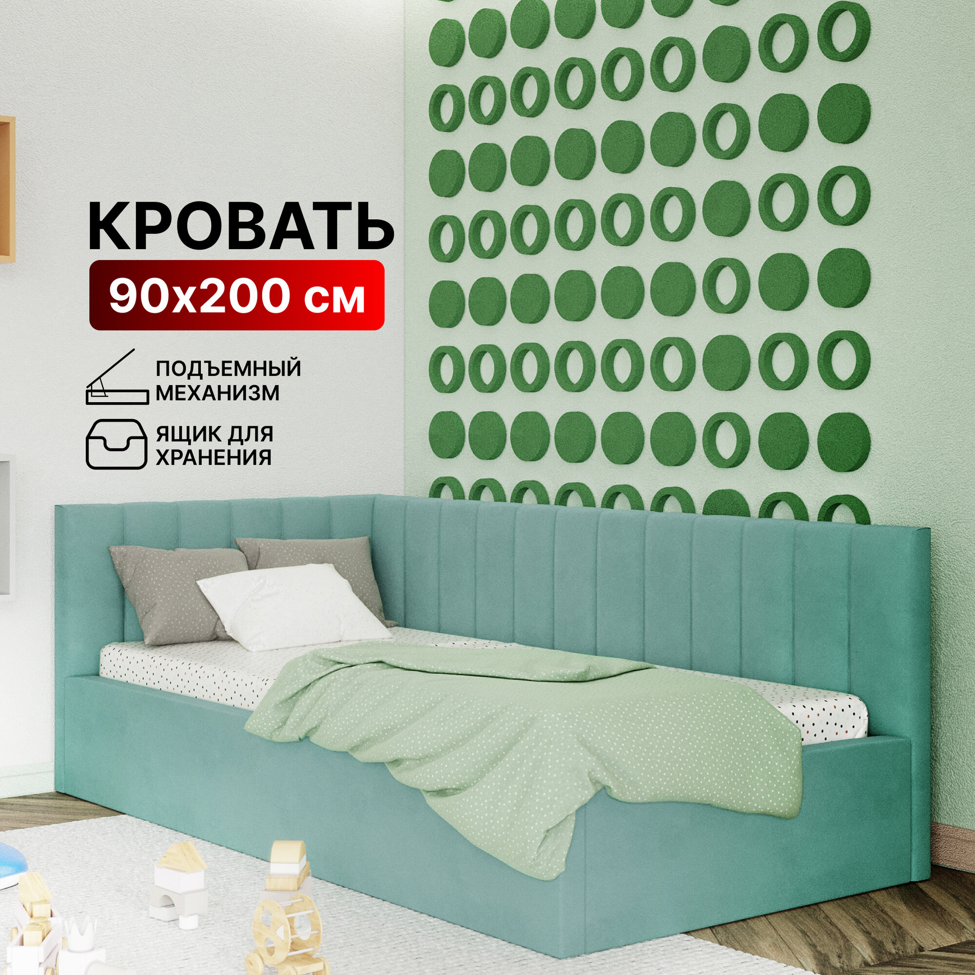 10 цен на Кровать 90х200 c подъемным механизмом и ящиком для белья Mia, велюр, мятный