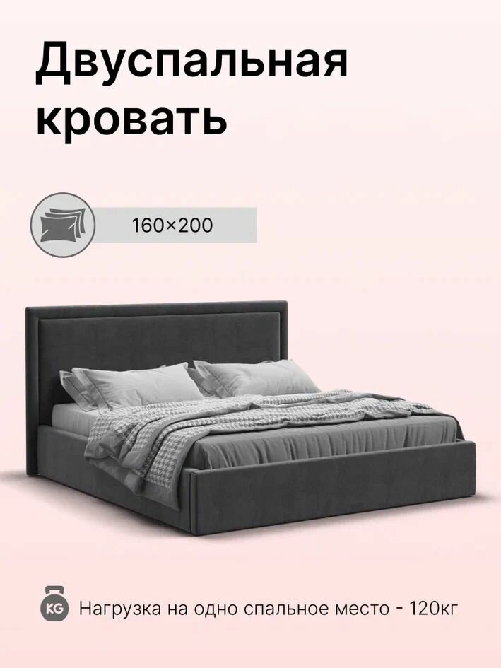Двуспальная кровать Фрея без подъемного механизма, велюр, цвет MONOLIT серый, 160х200 см информация: