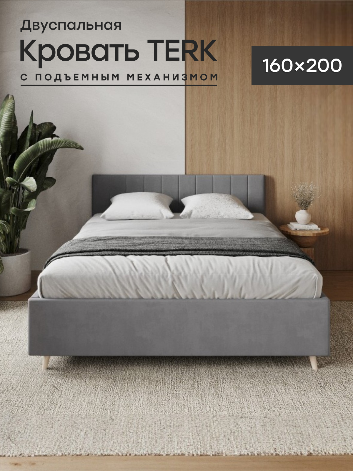 Кровать Hakkuna Matata "Dacota", двуспалная, с подъемным механизмом, серая, велюр, 160x200х88 см информация: