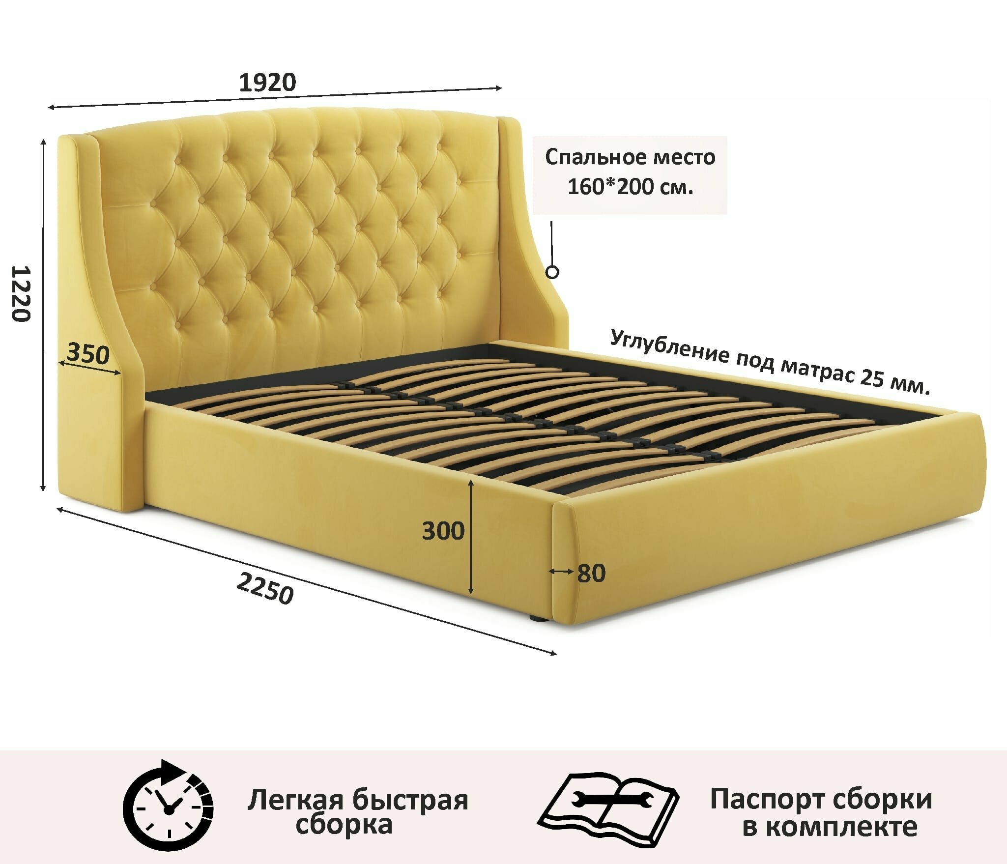 Двуспальная кровать Stefani 1600 желтая Zeppelin с ортопедическим основанием, 160х200, мягкая из велюра, ламели информация: