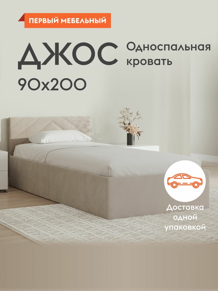 Кровать односпальная Джос 90х200 см, деревянная, с анатомическим основанием, с мягким изголовьем, Кремовый, велюр информация: