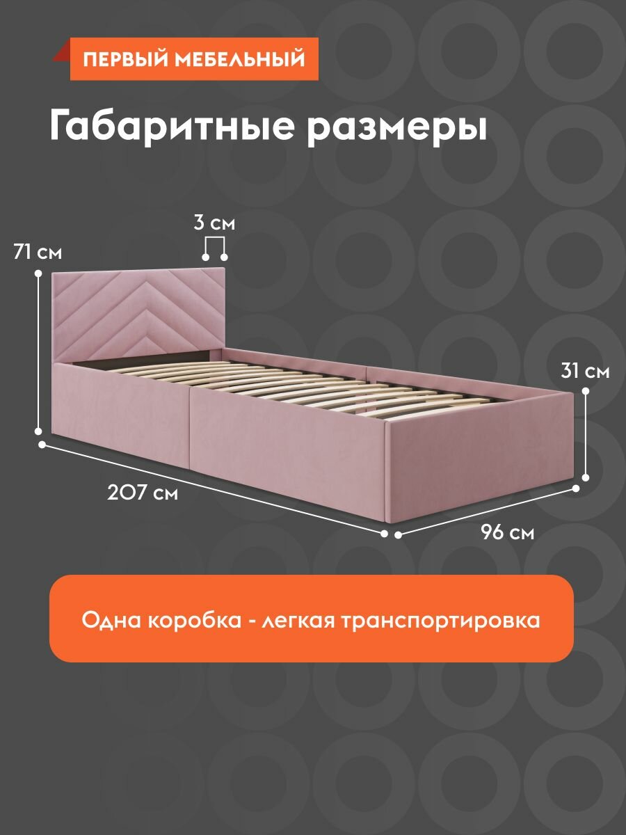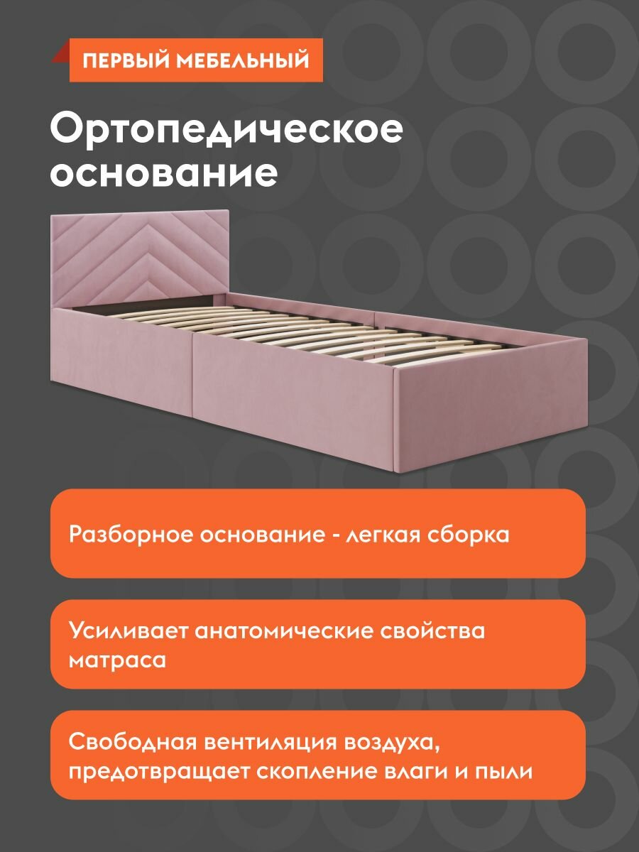 Кровать односпальная Джос 90х200 см, деревянная, с анатомическим основанием, с мягким изголовьем, Пудровый, велюр информация: