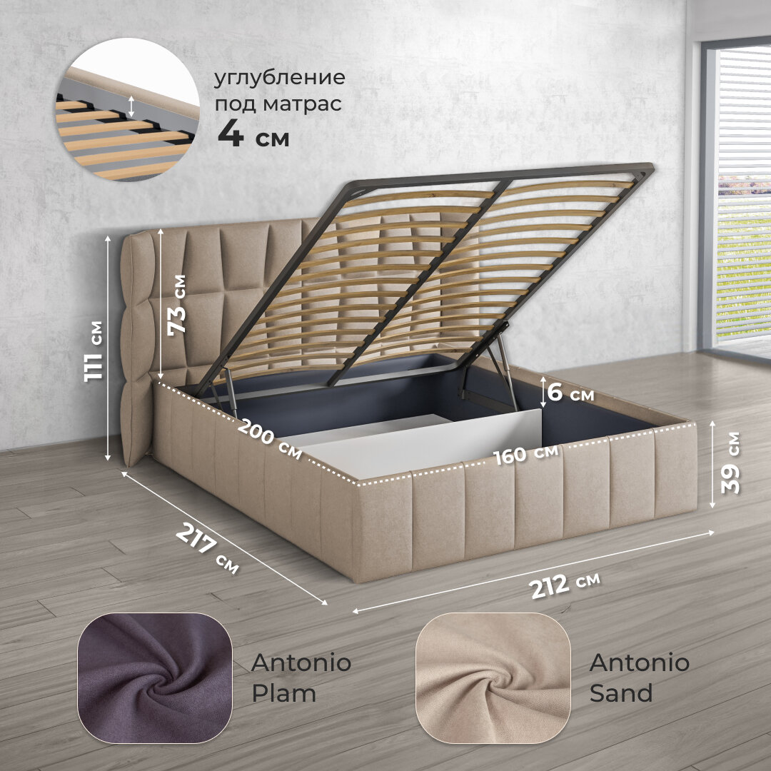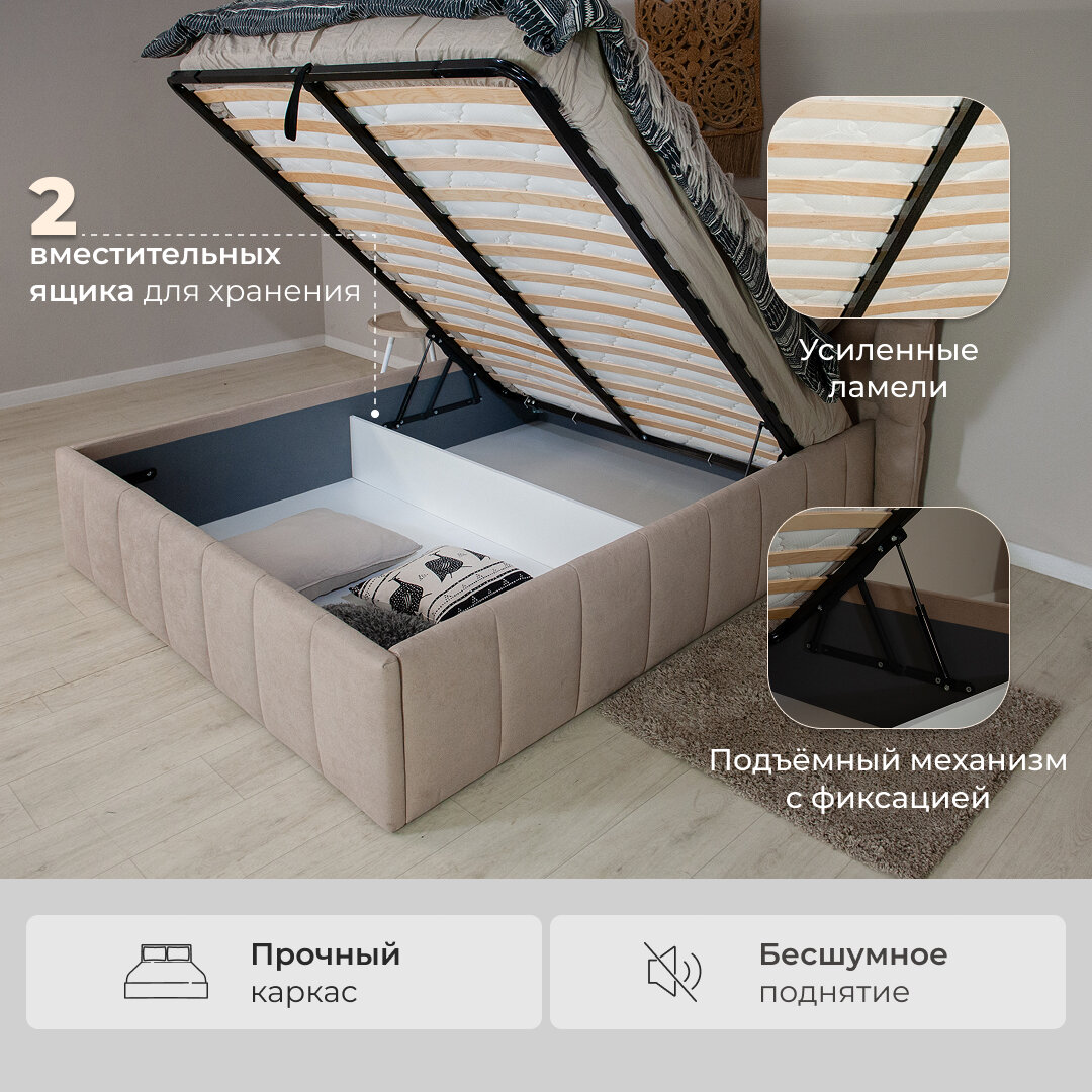 Кровать двуспальная с бельевым коробом, подъемный механизм 160х200 см ортопедическое основание Габриэль бежевый Antonio sand информация: