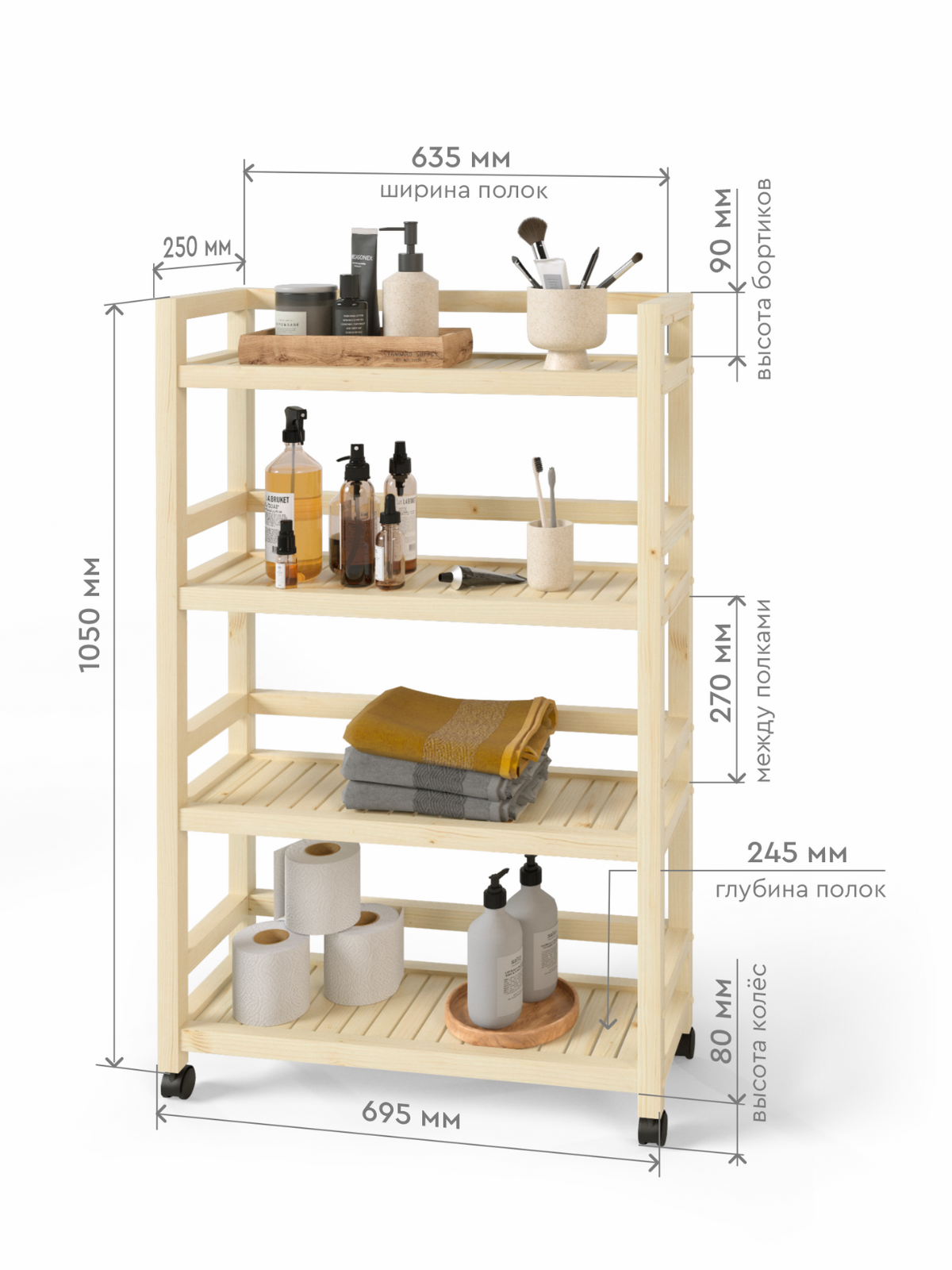 Этажерка на колесиках 105х70х25 см, стеллаж деревянный универсальный 4 полки информация: