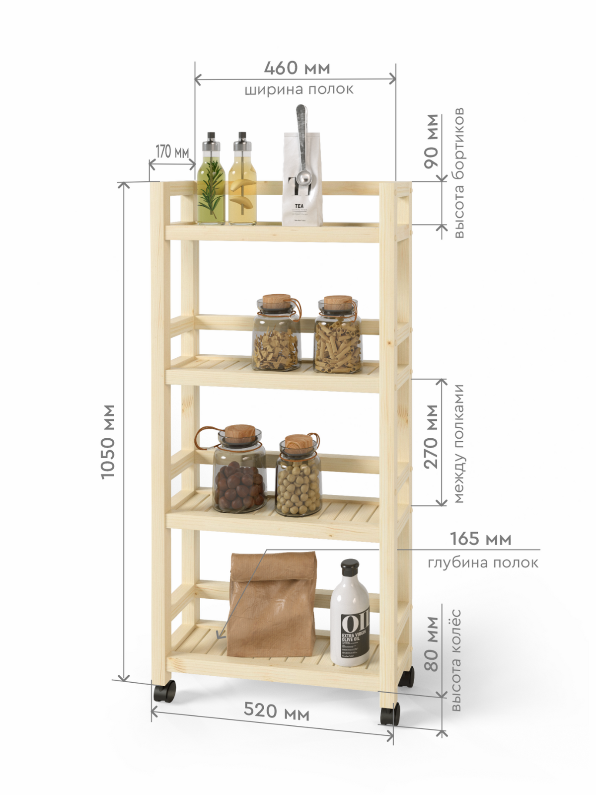 Этажерка на колесиках 105х52х17 см, стеллаж деревянный универсальный 4 полки информация: