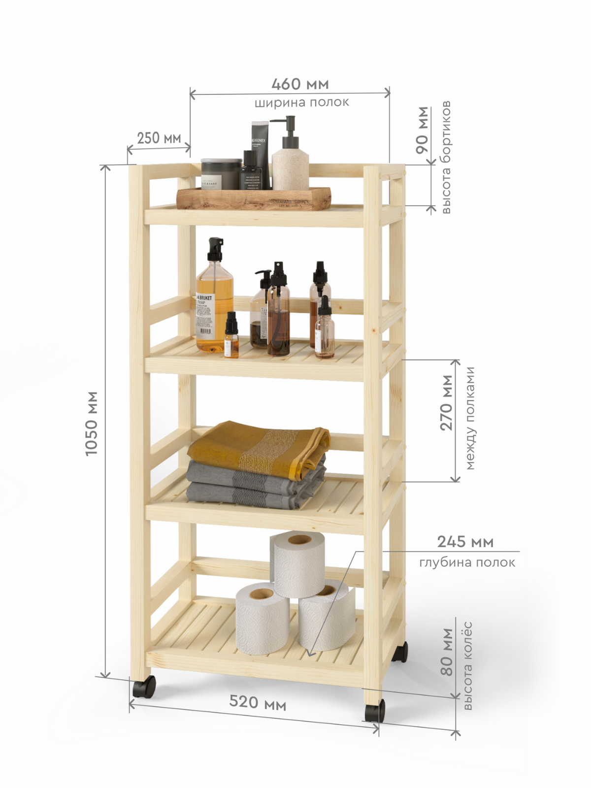 Этажерка на колесиках 105х52х25 см, стеллаж деревянный универсальный 4 полки информация: