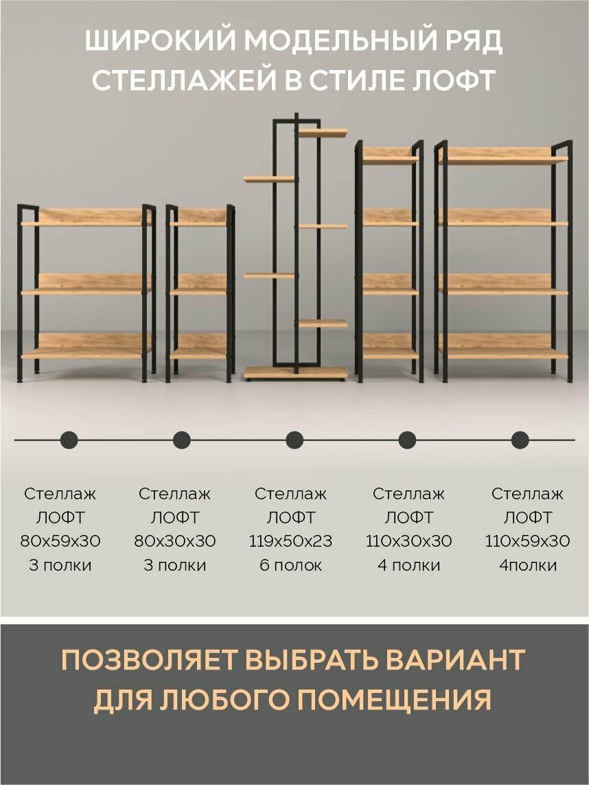 Стеллаж Айсберг Лофт 40/6 / Черный/ с полками дуб крафт табак/ Для дачи/ для дома/ для книг/ в офис