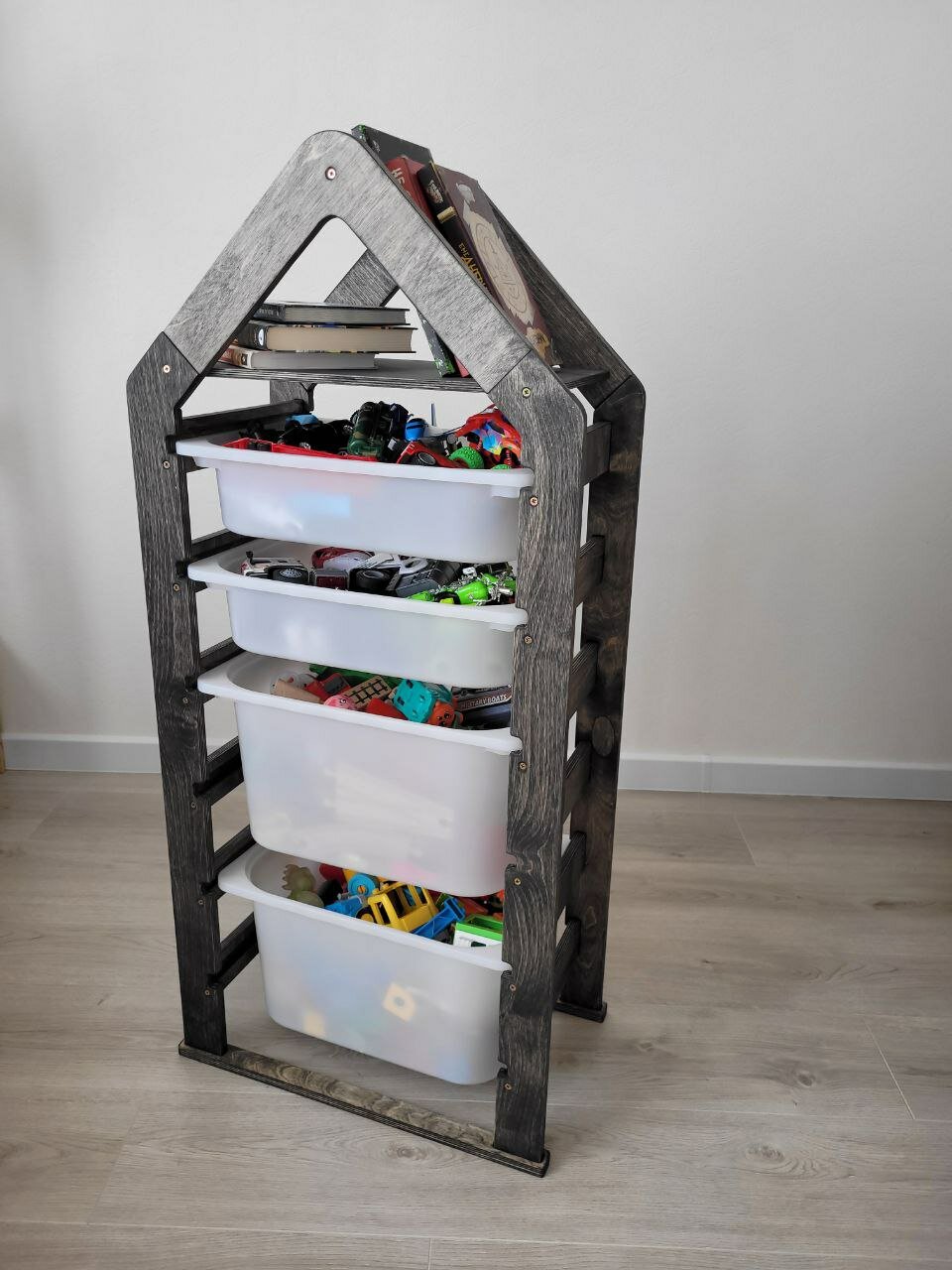 Стеллаж деревянный напольный для игрушек с полкой черный графит информация: