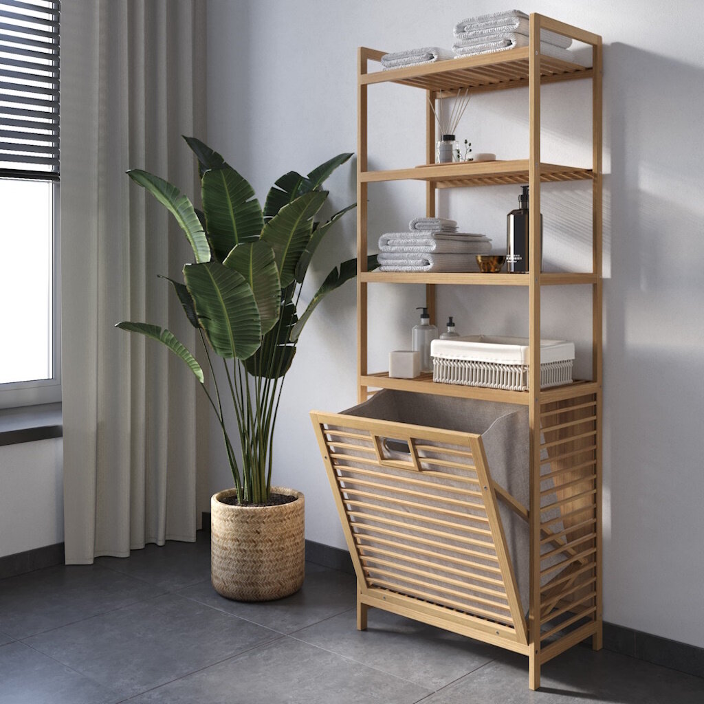 Отзывы на Этажерка для ванной из бамбука, Стеллаж для хранения с корзиной для белья Bambuchka, 50x30x143 см