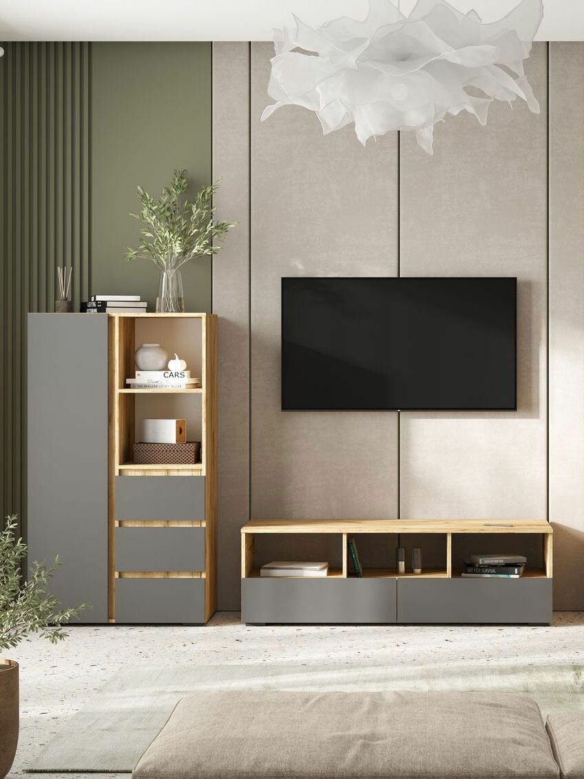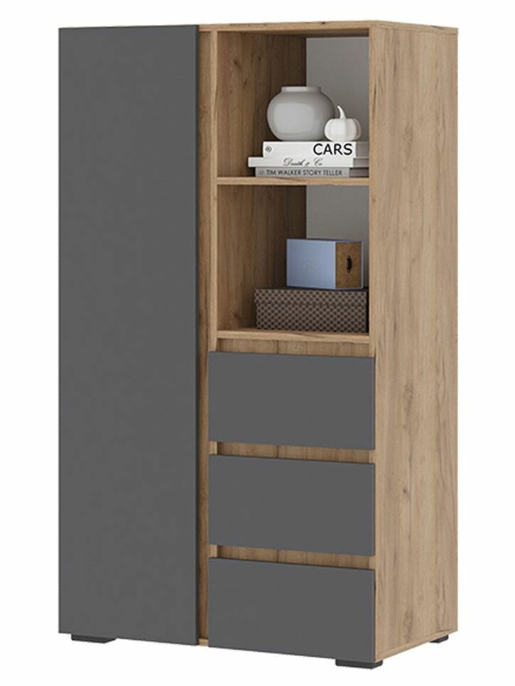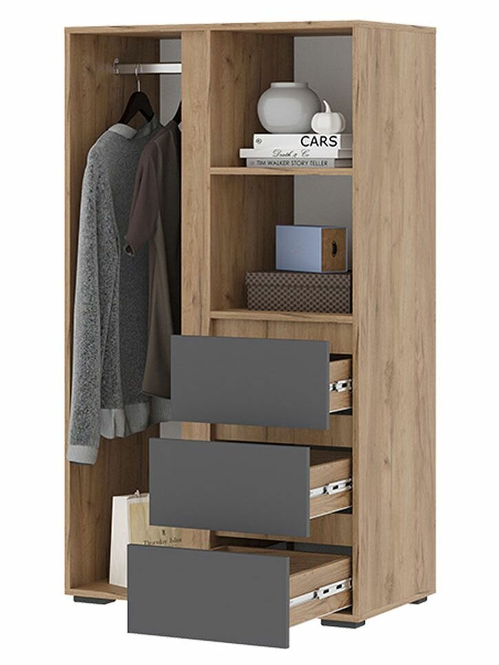 10 цен на Стеллаж деревянный Ирэн напольный, с дверцей, с ящиками, с полками, со штангой, 80.2х46х141.4 см, Дуб Крафт золотой / Графит серый