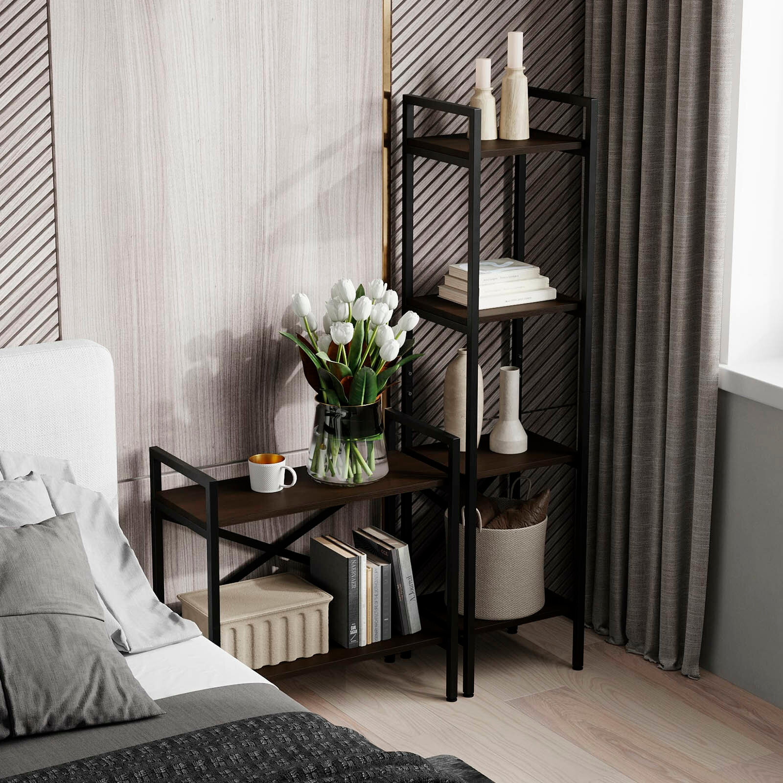 10 цен на Стеллаж HYLLA LOFT, темно-коричневый, напольный, модульный шкаф с 4 деревянными полками, 141х34х30 см, гростат