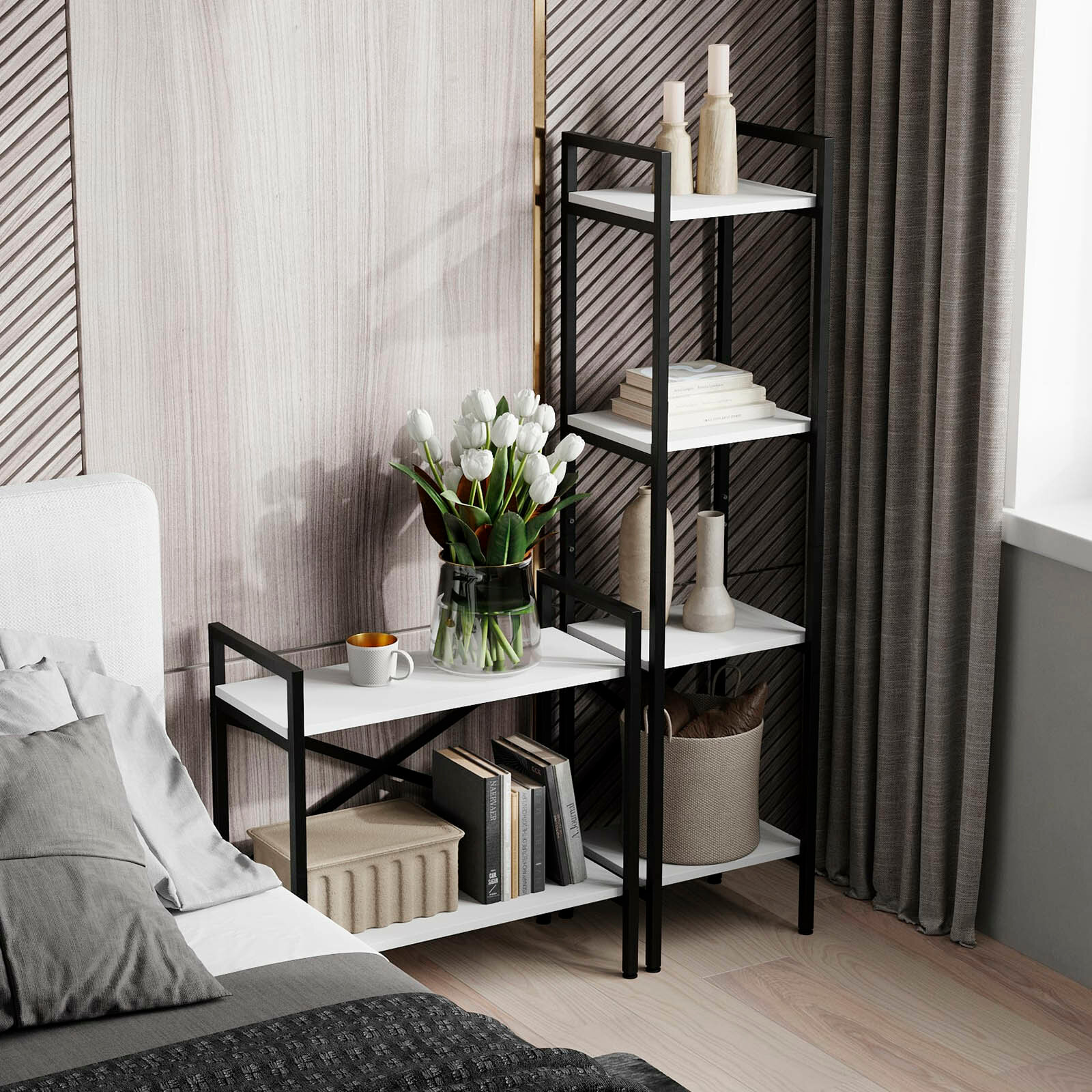 10 цен на Стеллаж HYLLA LOFT, белый, напольный, модульный шкаф с 4 деревянными полками, 141х34х30 см, гростат