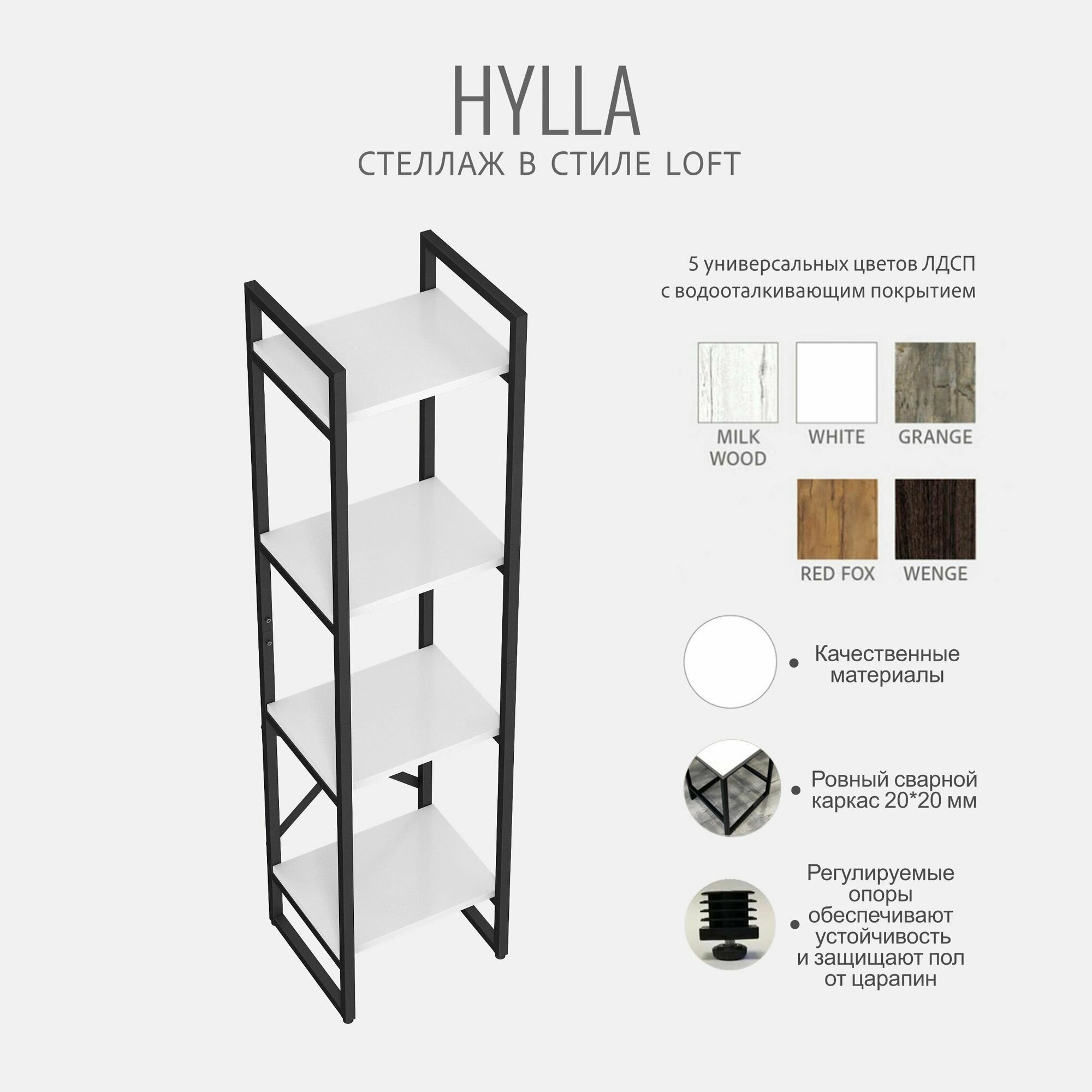 Стеллаж HYLLA LOFT, белый, напольный, модульный шкаф с 4 деревянными полками, 141х34х30 см, гростат информация: