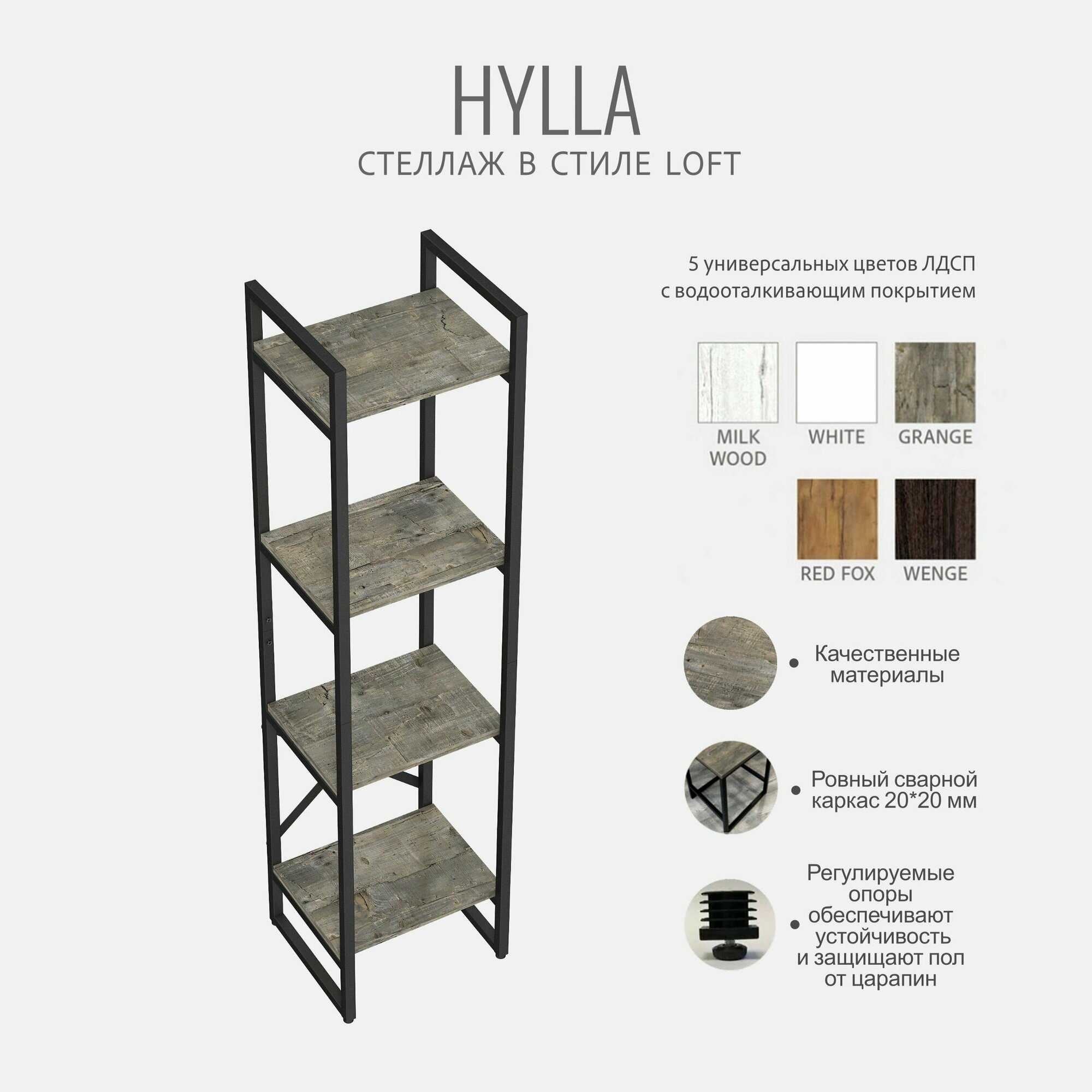 Стеллаж HYLLA LOFT, серый, напольный, модульный шкаф с 4 деревянными полками, 141х34х30 см, гростат информация: