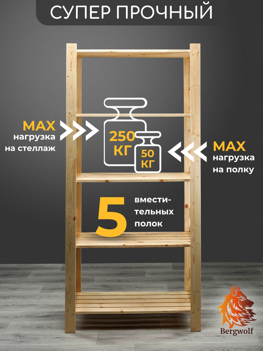 Отзывы на Стеллаж деревянный высокий 182х86х42 см, отшлифован, 5 полок, нагрузка 250 кг